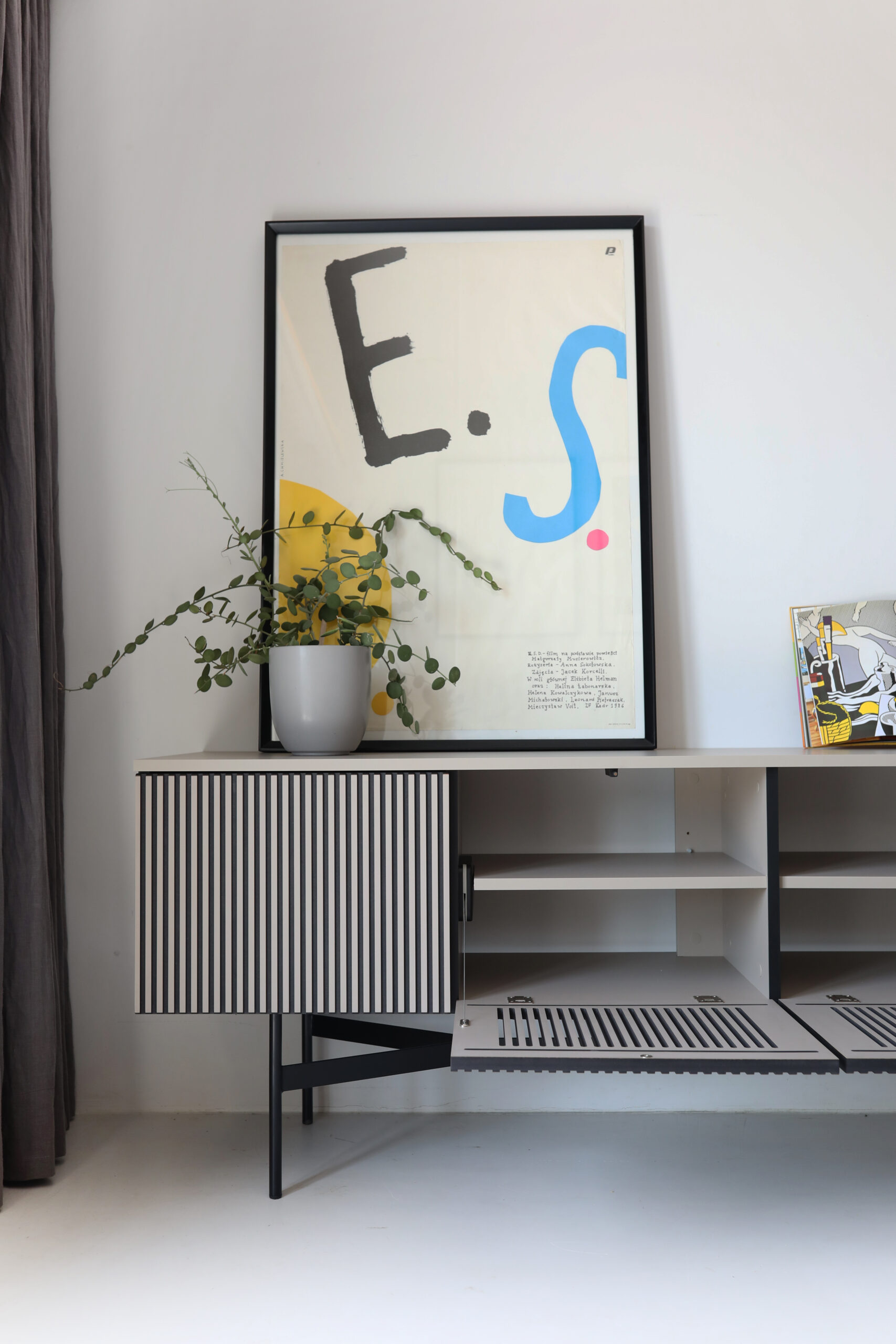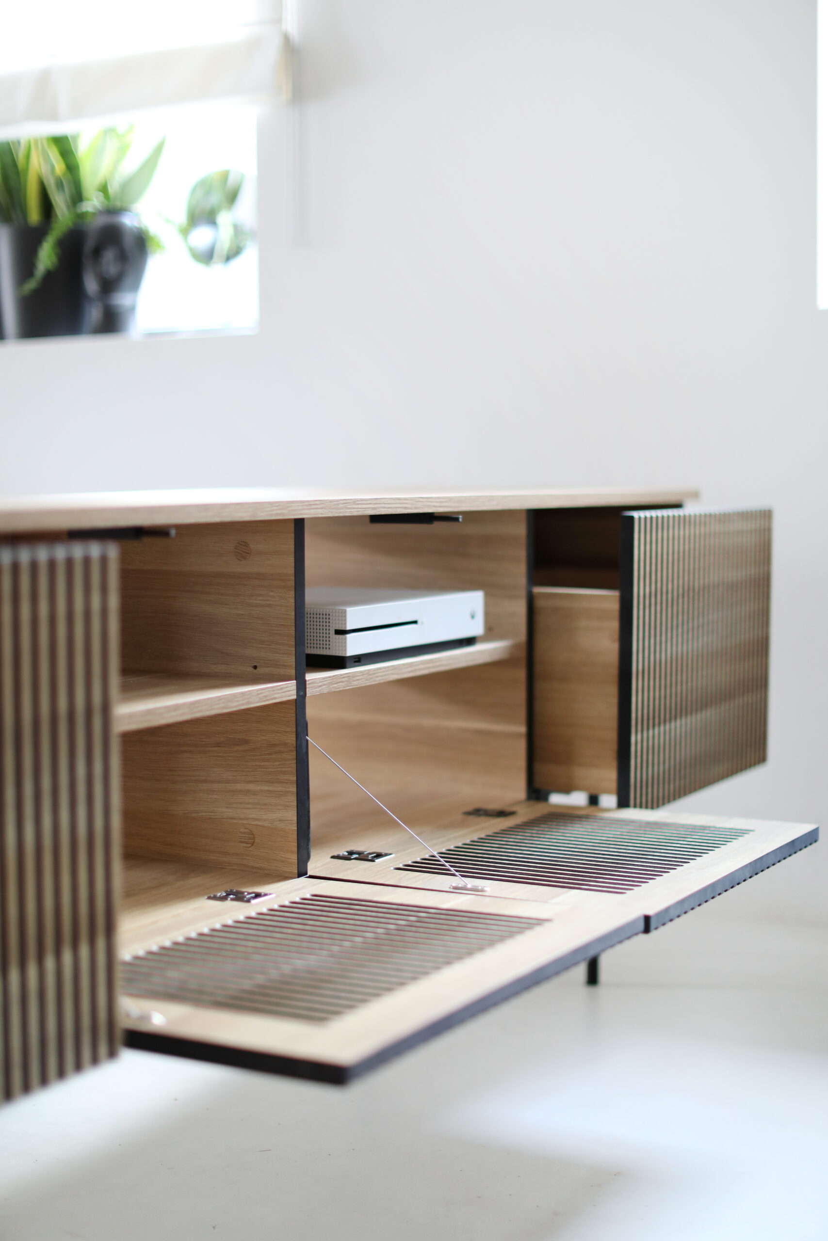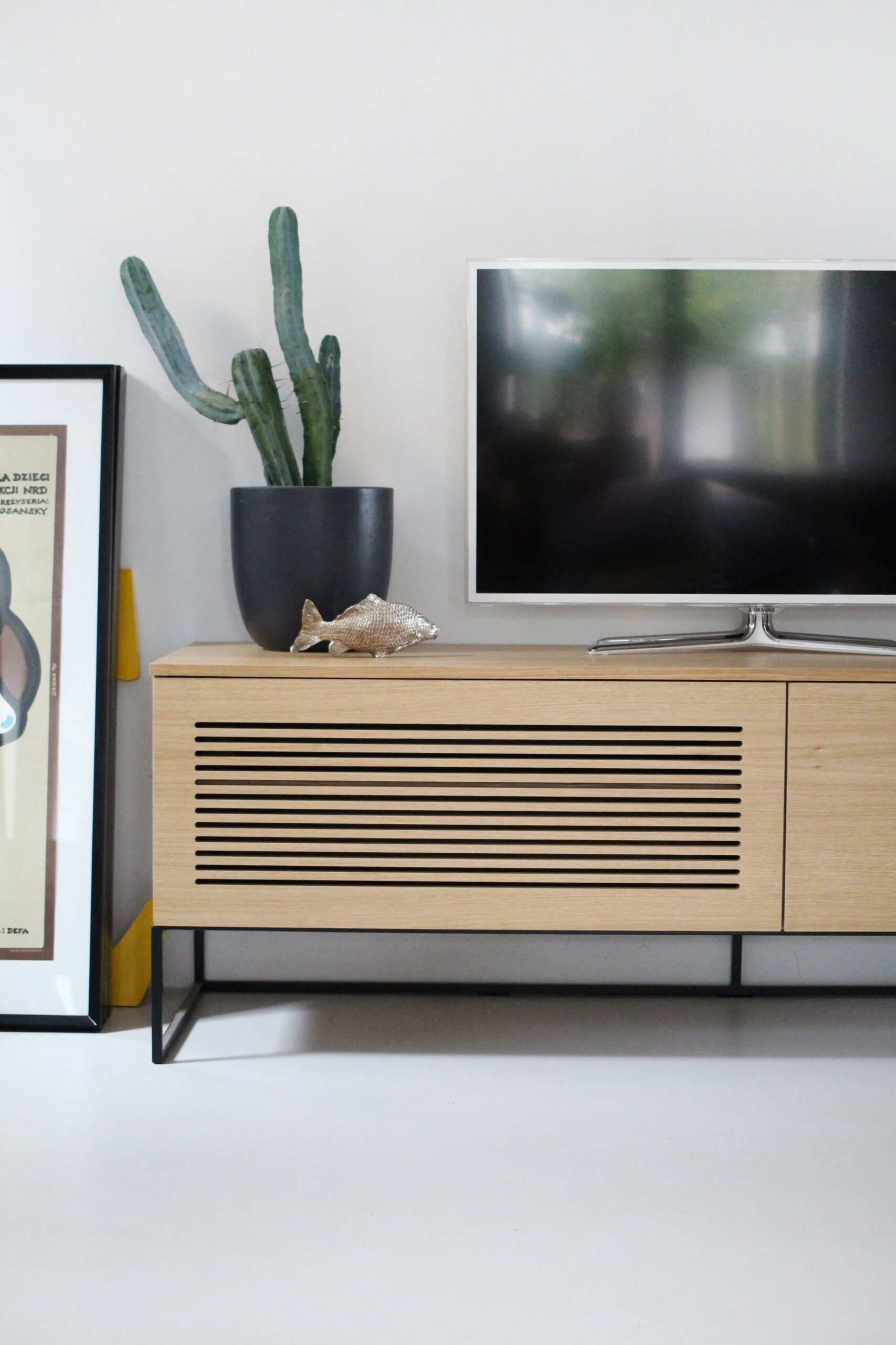 Rozwiązanie: Specjalnie opracowane, autorskie fronty z horyzontalnymi otworami, które są bardzo estetyczne, a jednocześnie pozwalają na obsługę pilotem sprzętów znajdujących się w środku szafki. Koniec z kurzeniem się dekodera na blacie!