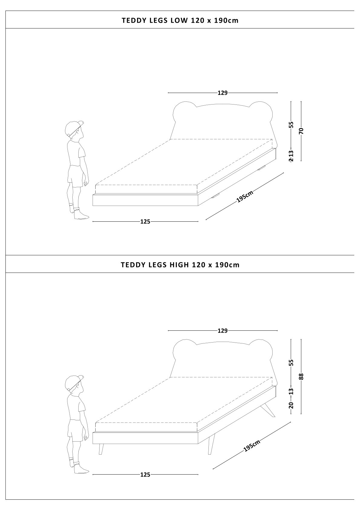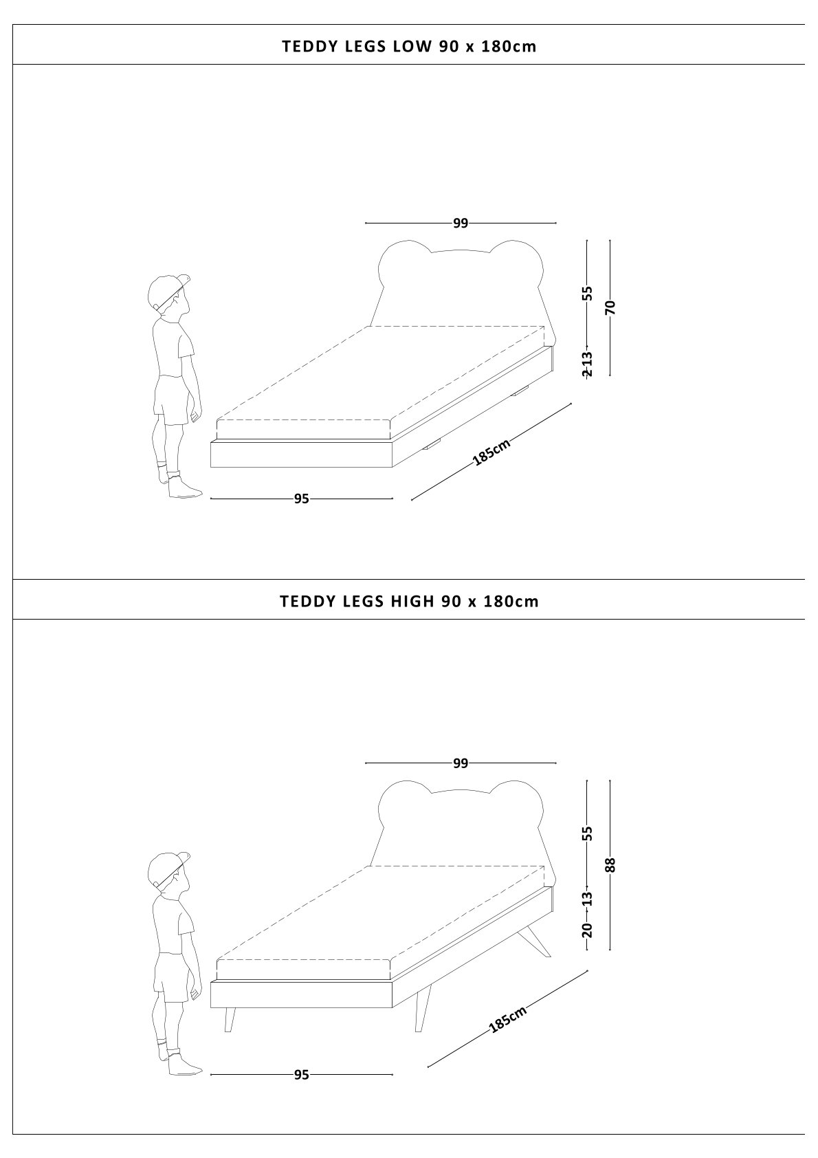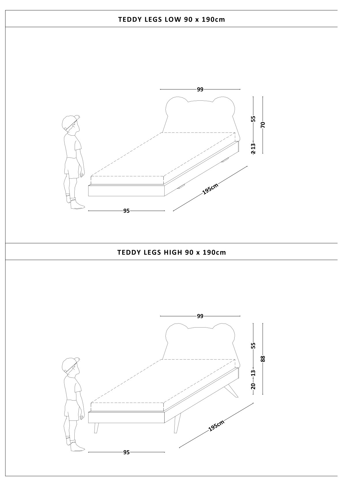 W tej ofercie prezentujemy łóżko dziecięce Legs Texti z tapicerowaną ramą oraz zagłówkiem w kształcie misia, usytuowanych na drewnianych nóżkach bukowych.