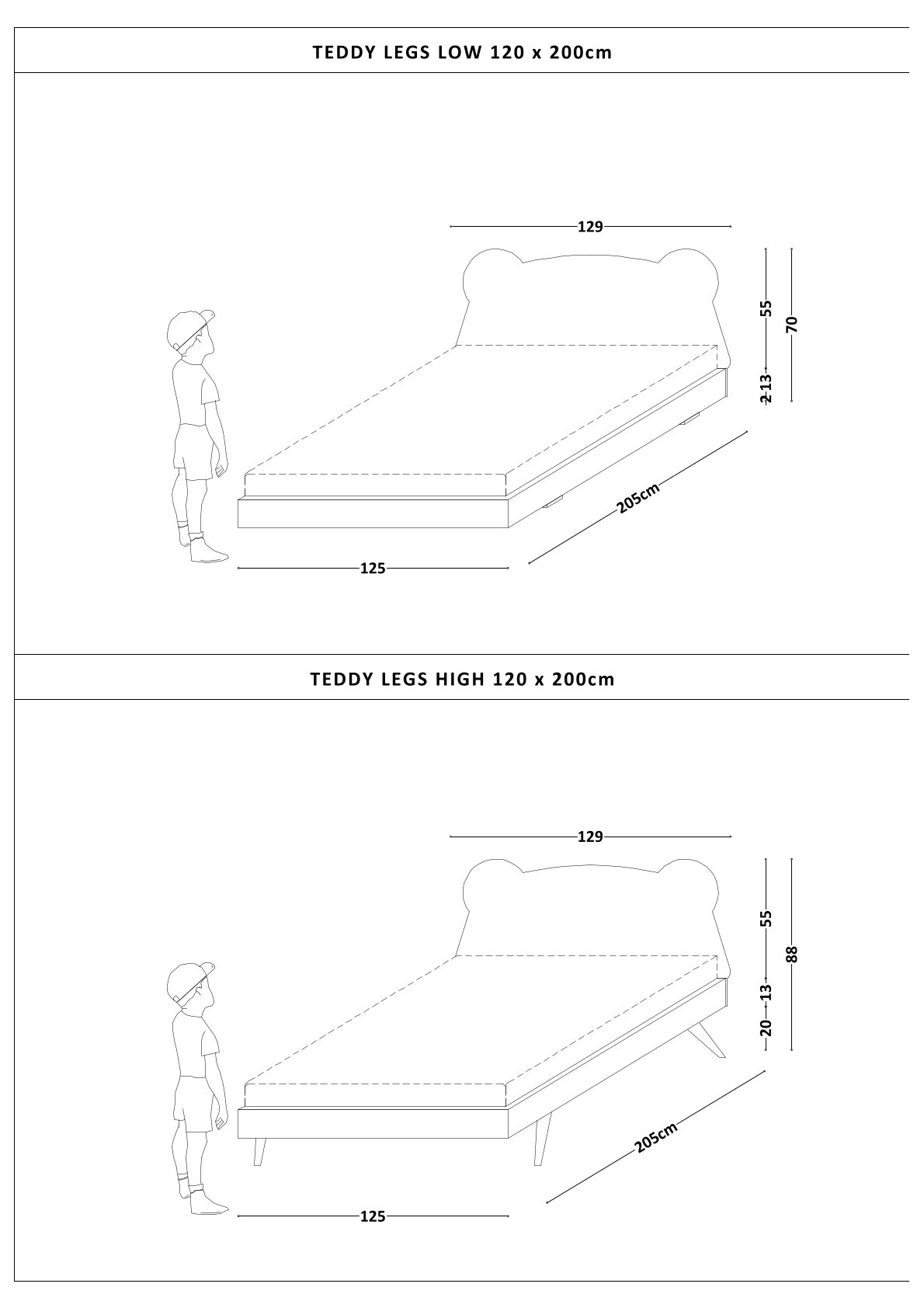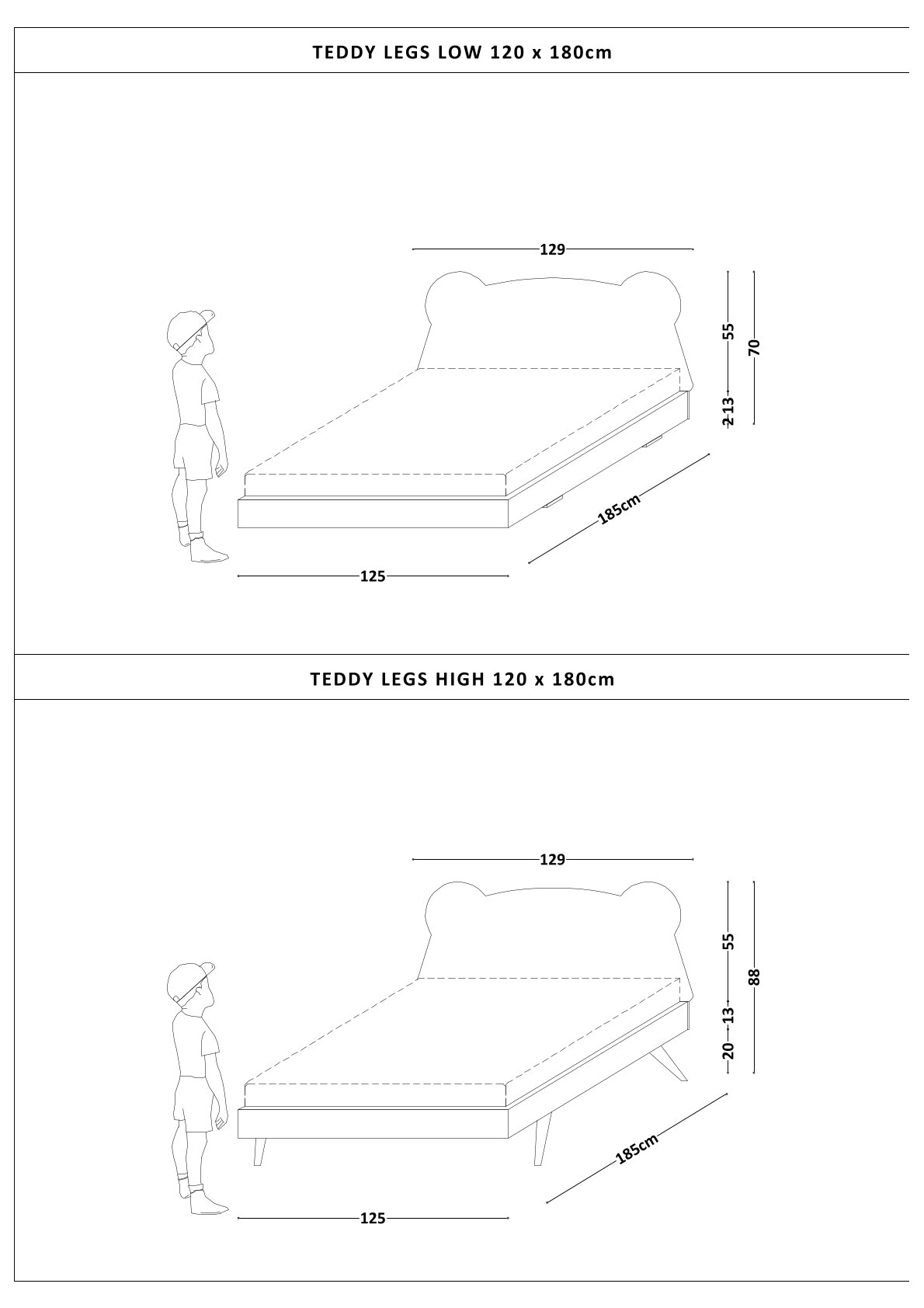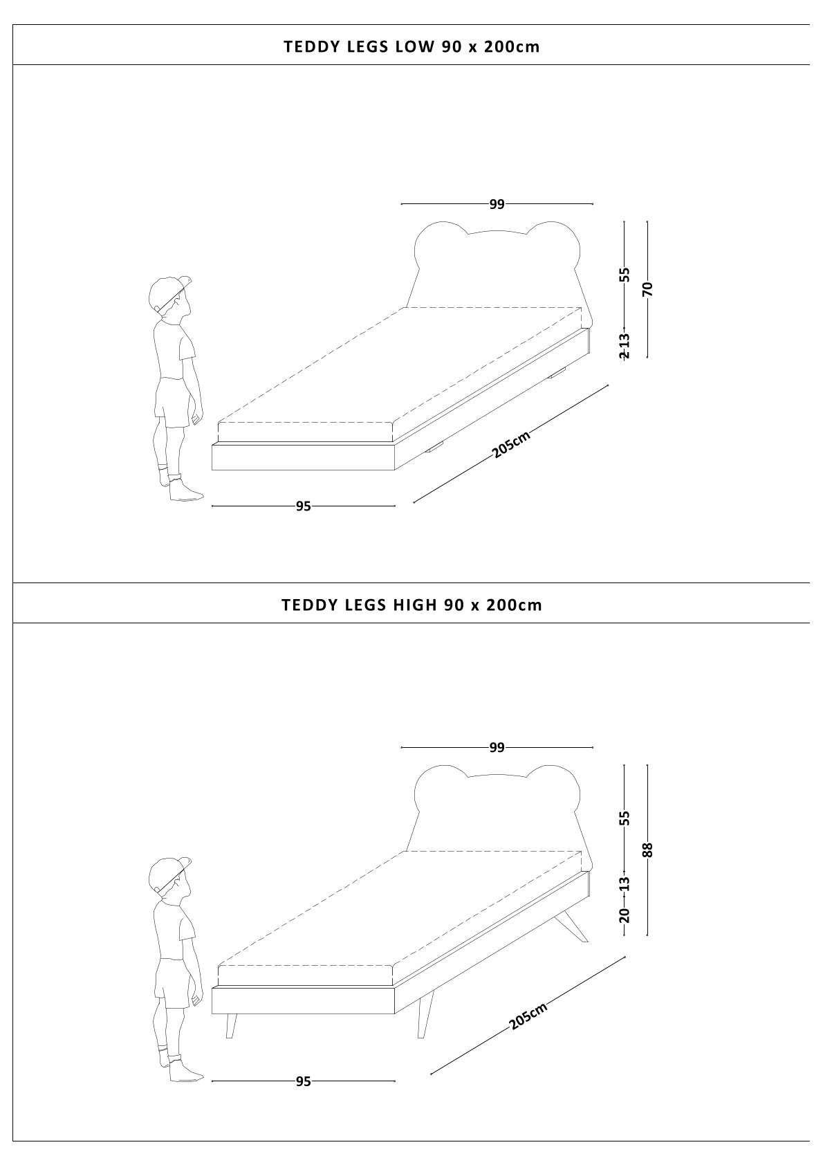 W tej ofercie prezentujemy łóżko dziecięce Legs Texti z tapicerowaną ramą oraz zagłówkiem w kształcie misia, usytuowanych na drewnianych nóżkach bukowych.