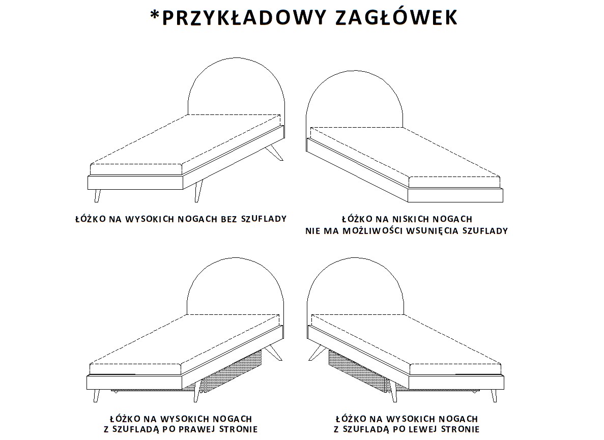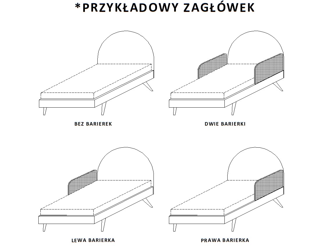 Boczki są standardowo w kolorze ramy łóżka, a ich położenie w konfiguratorze (“prawy” czy “lewy”) określa się “stojąc przodem” do zagłówka:
