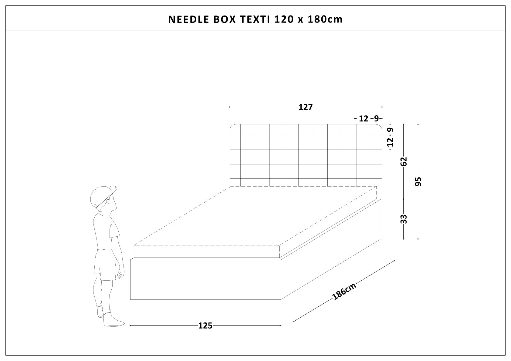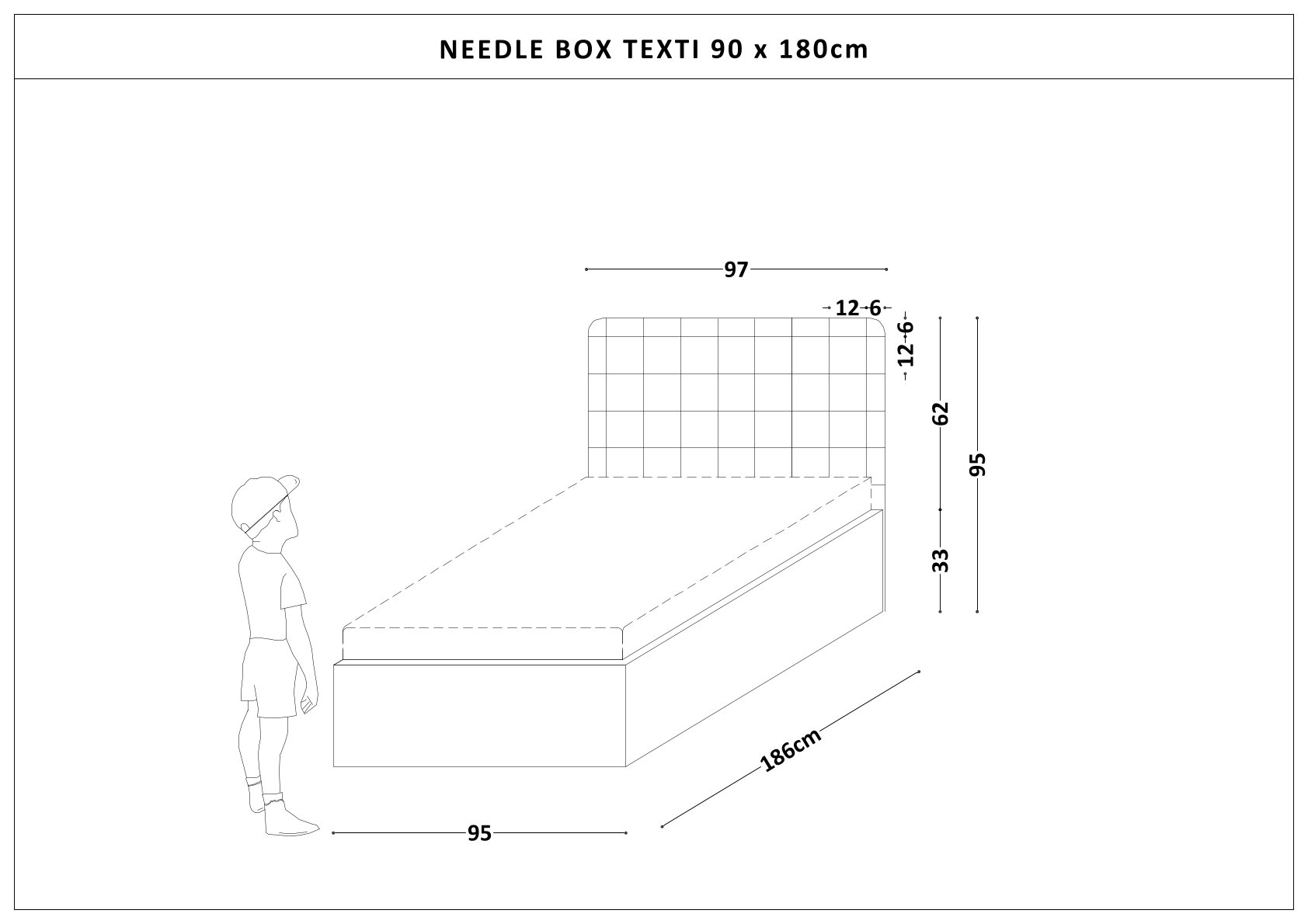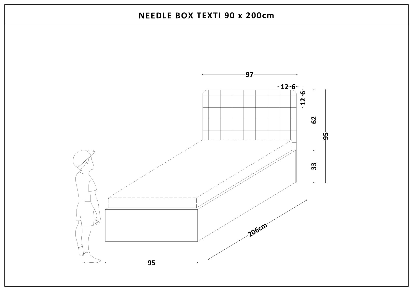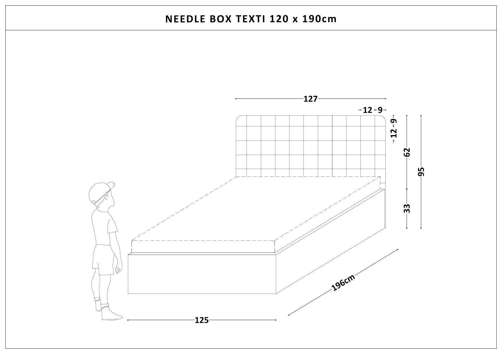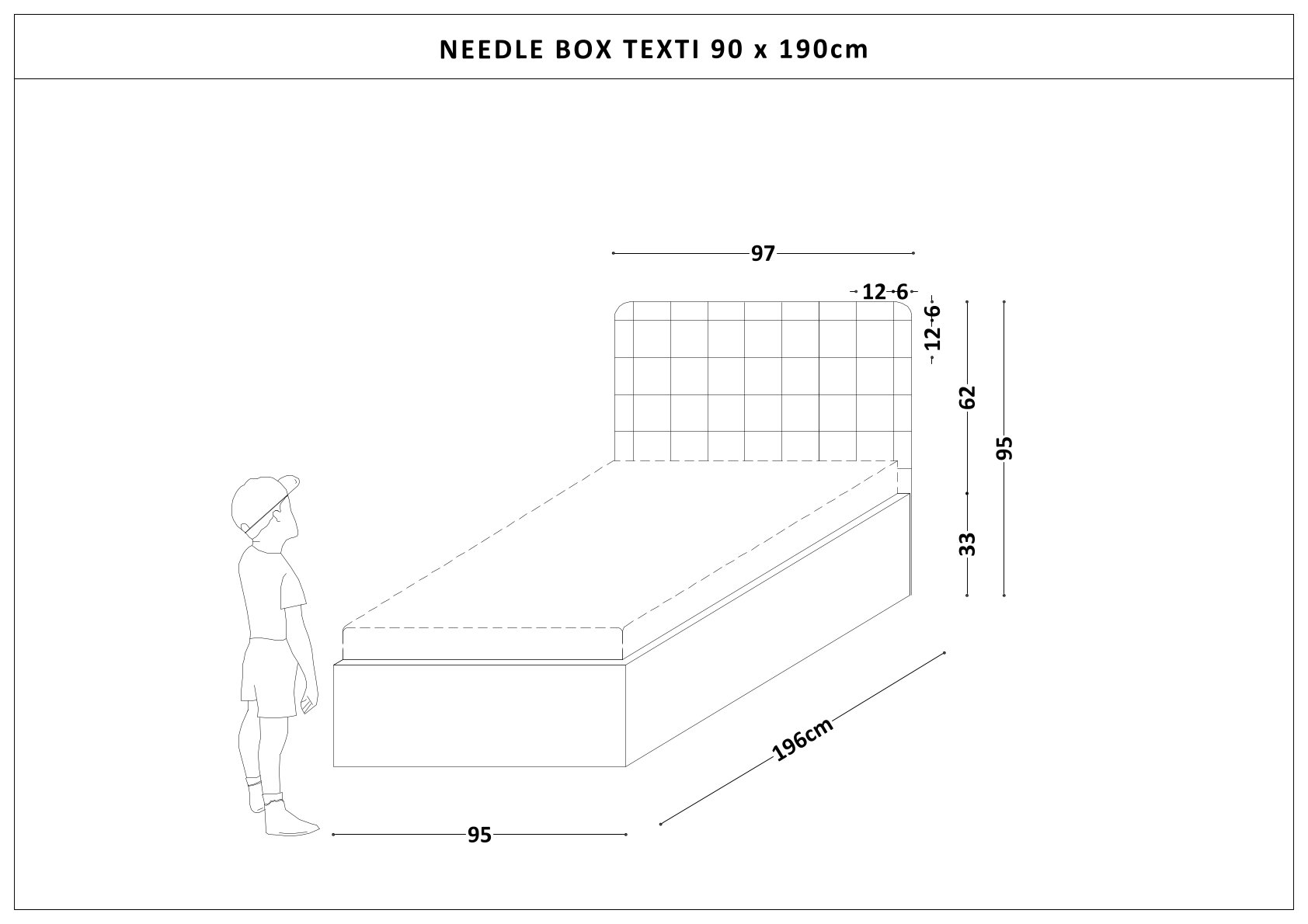 W tej ofercie możesz zakupić łóżko dziecięce Box Texti w wersji z tapicerowanym zagłówkiem oraz tapicerowaną skrzynią na pościel, na małych drewnianych nóżkach.