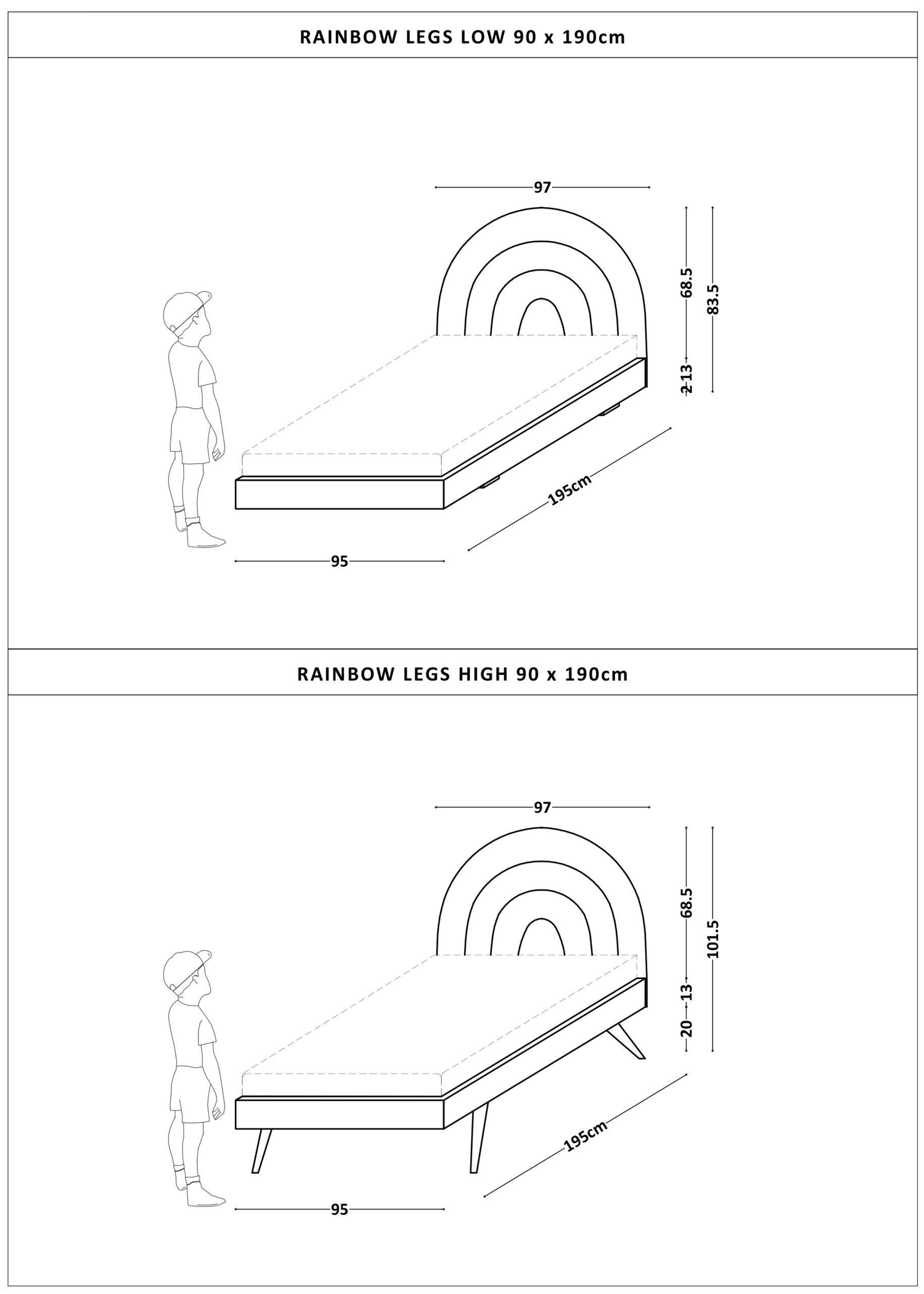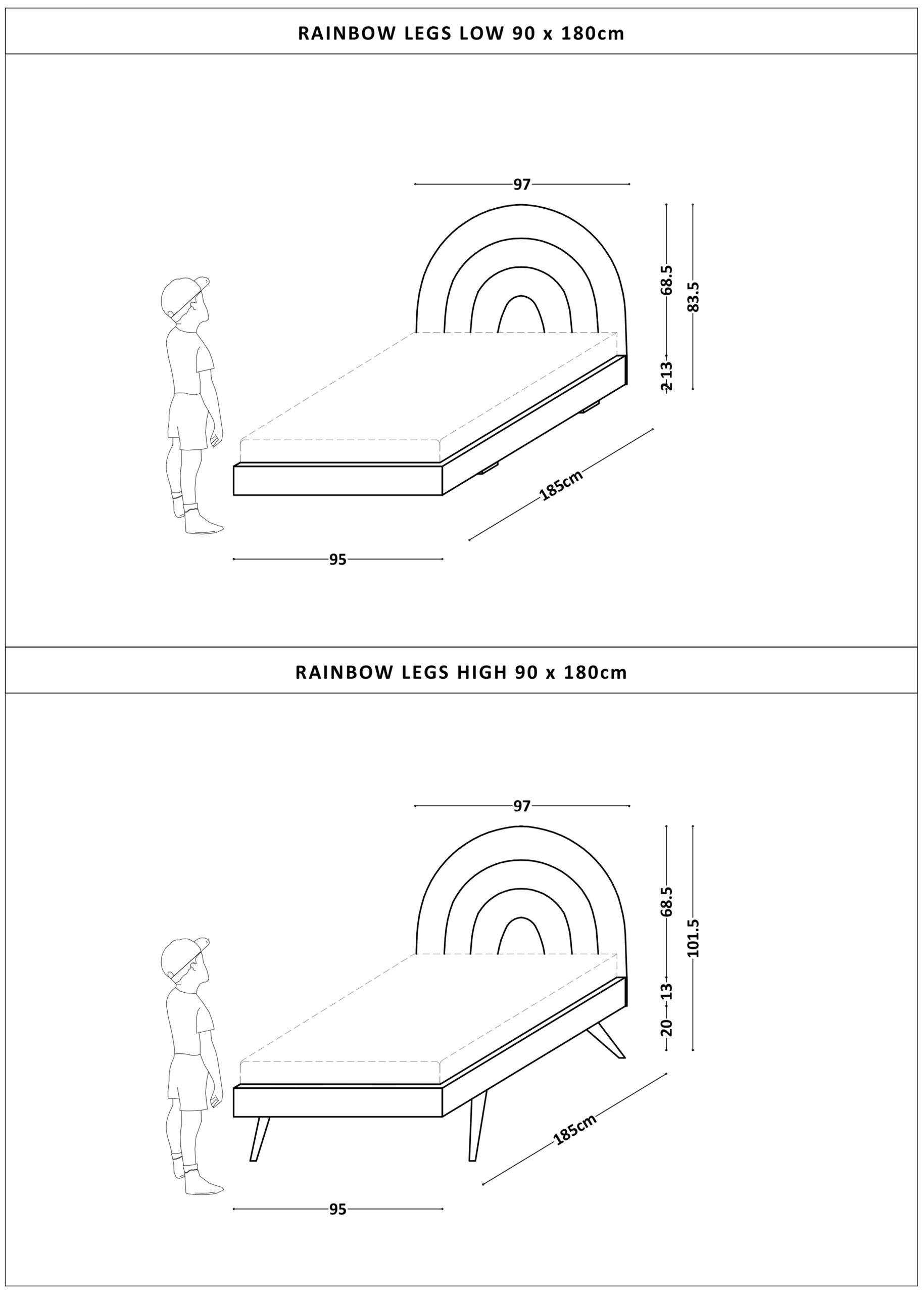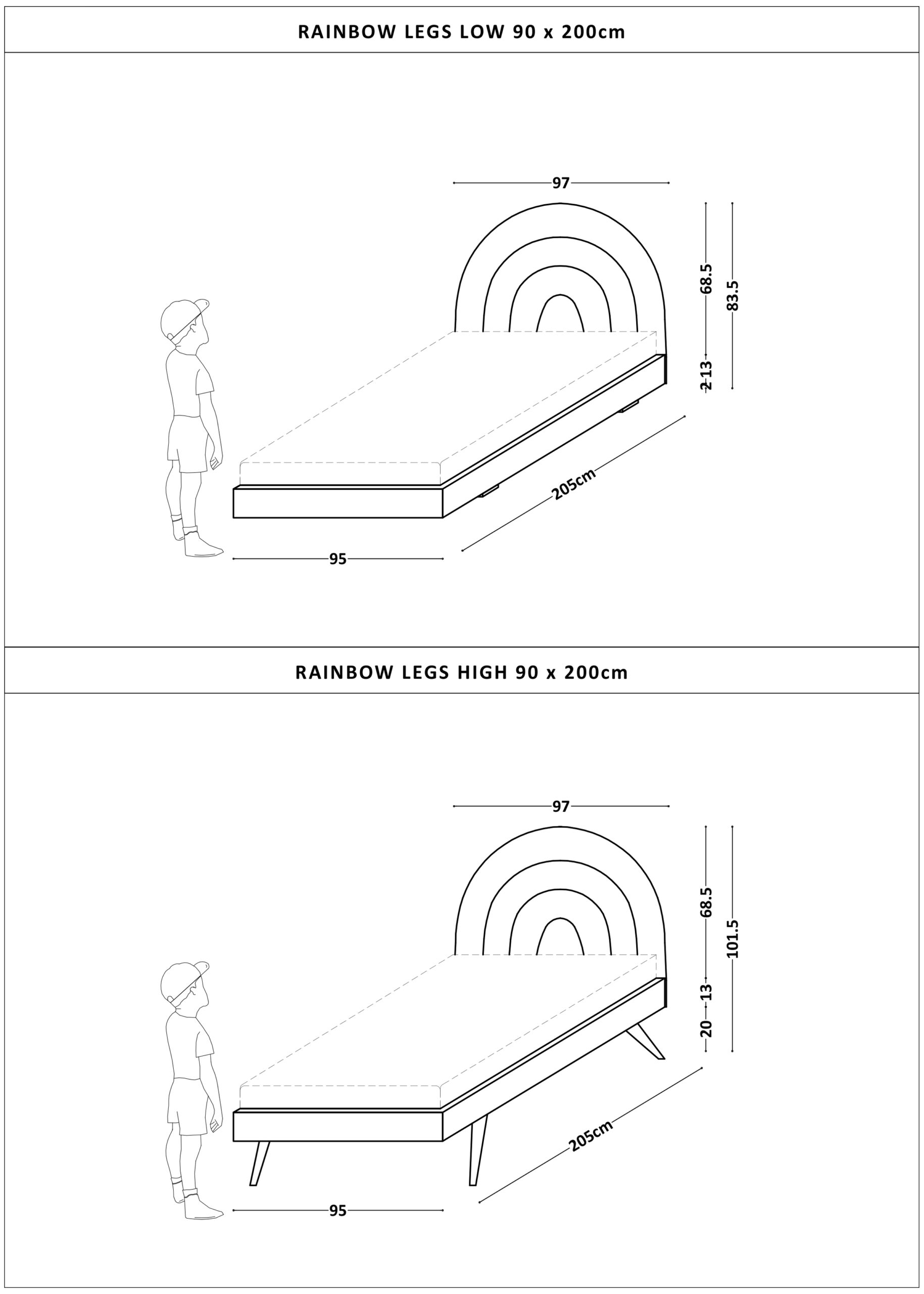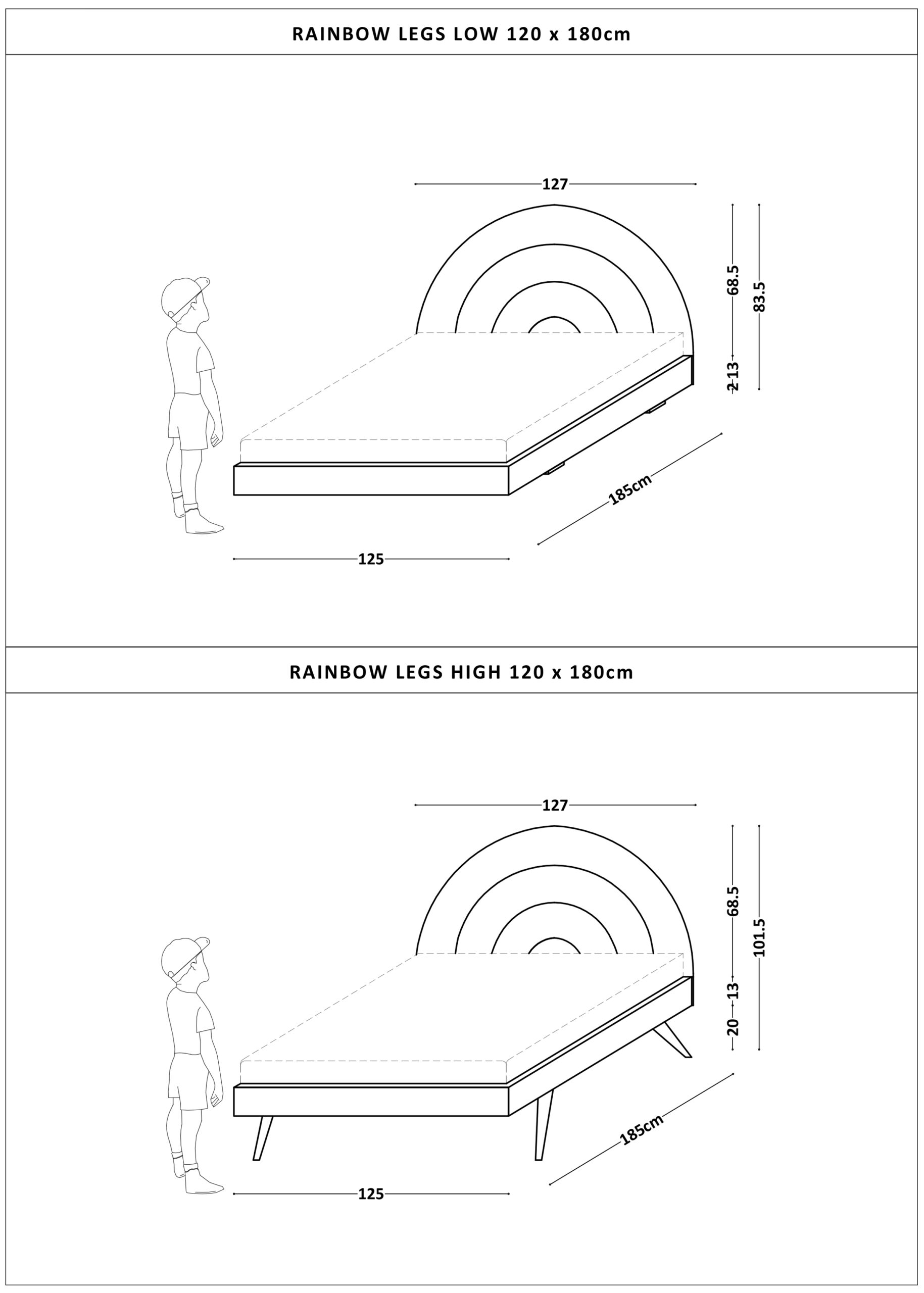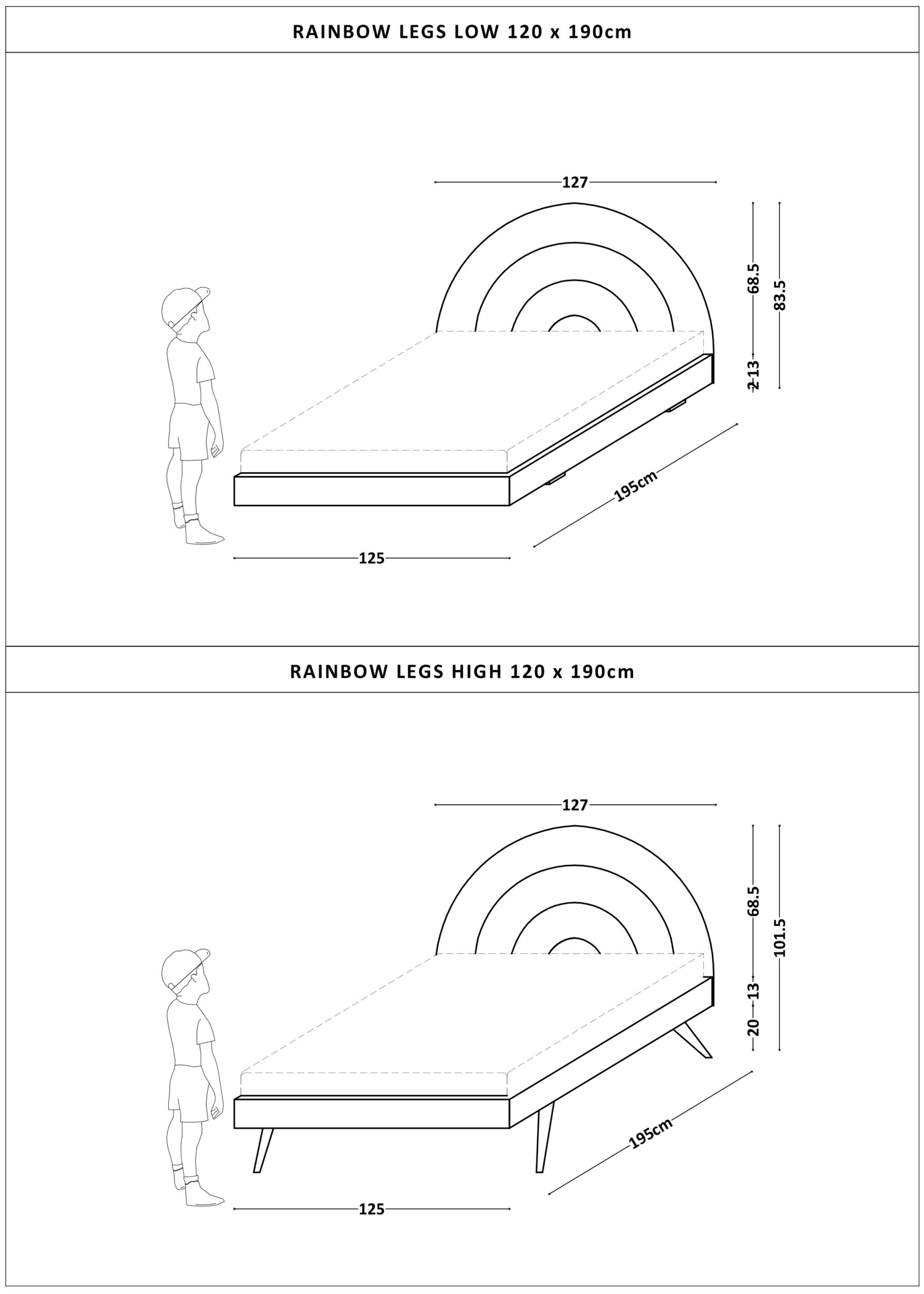 Łóżko dziecięce RAINBOW LEGS TEXTI to wersja z lekką, tapicerowaną ramą oraz z tęczowym zagłówkiem dostępnym w 5 zestawieniach kolorystycznych. Rama łóżka otapicerowana jest tą samą tkaniną, co ostatni, zewnętrzny łuk tęczy. Materiały, których używamy do produkcji naszych mebli, posiadają certyfikat OEKO TEX, co oznacza, że są ekologiczne i bezpieczne dla Ciebie i Twojego dziecka. Łóżko posiada solidną, drewnianą konstrukcję, która zagwarantuje bezpieczeństwo podczas zabawy i odpoczynku. Najwyższej jakości stelaż, wykonany z drewnianych, bardzo elastycznych listewek “pracuje” razem z materacem i zapewnia komfort podczas snu. Nogi łóżka wykonane zostały ze szlachetnego, naturalnego drewna bukowego lub dębowego.