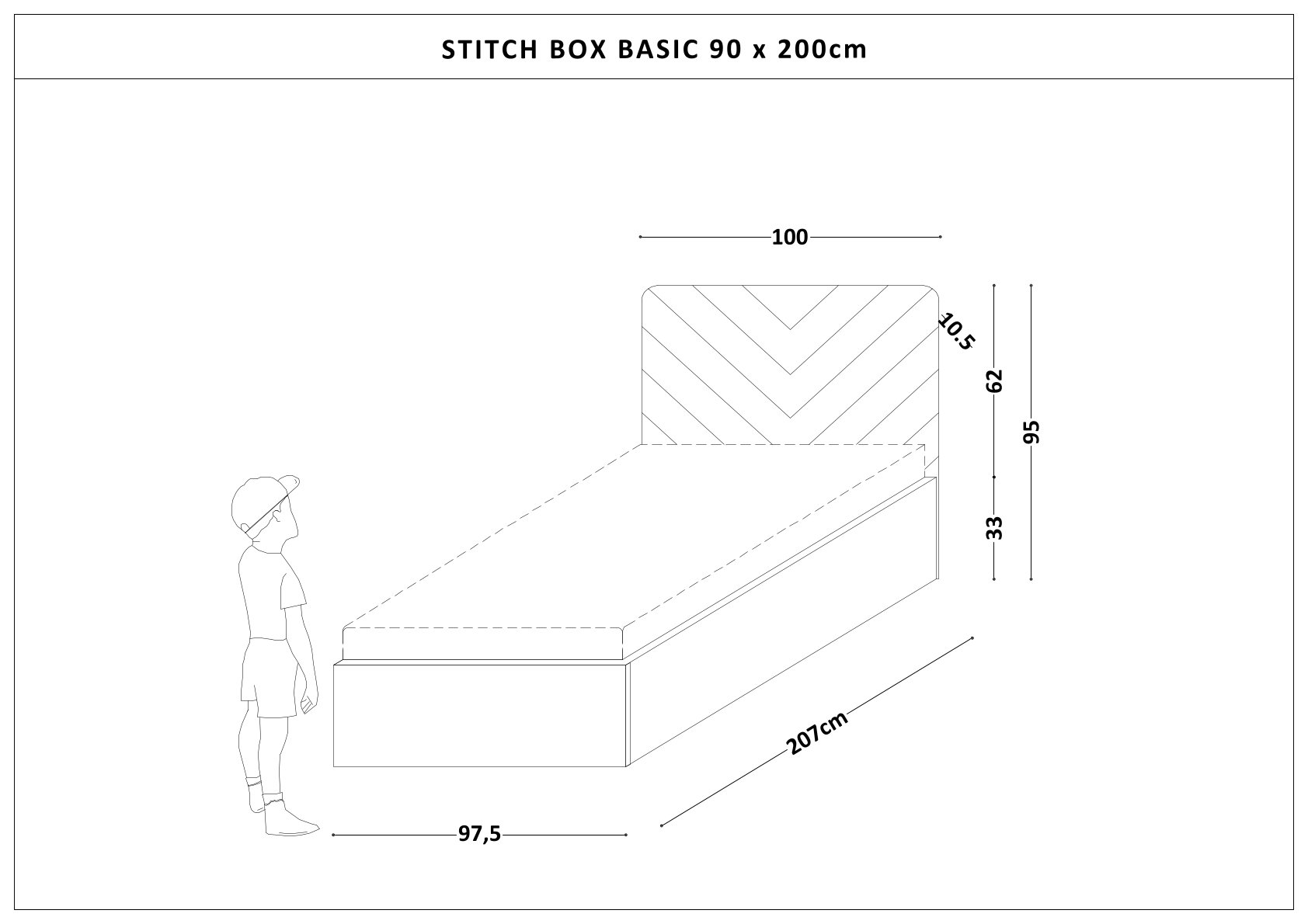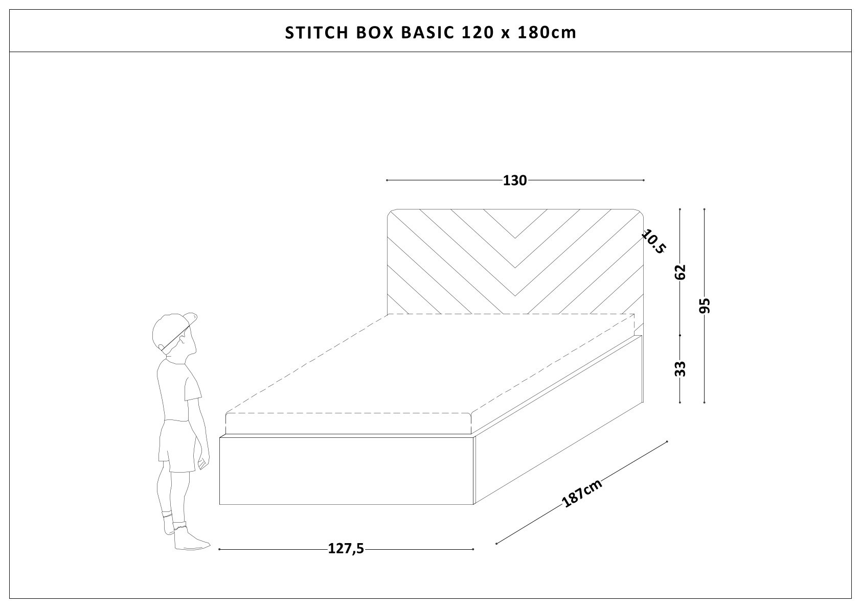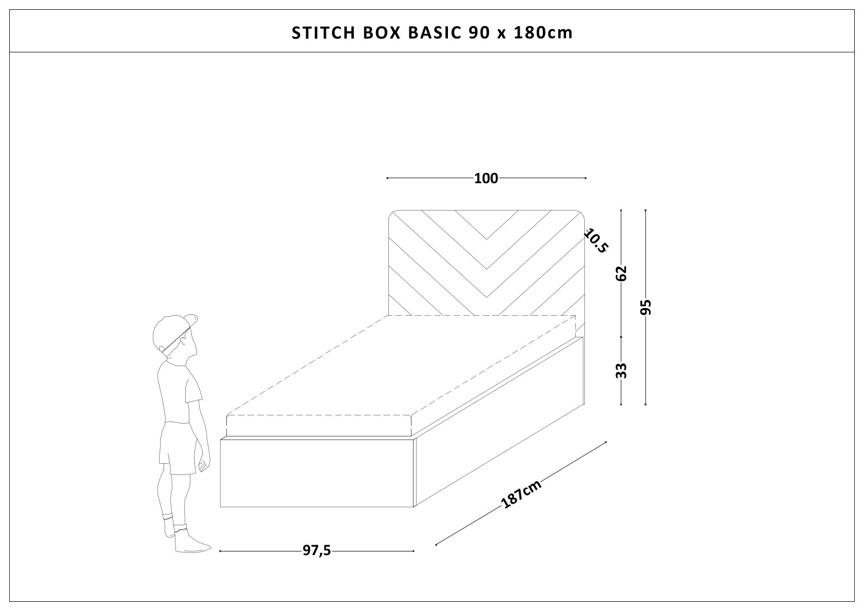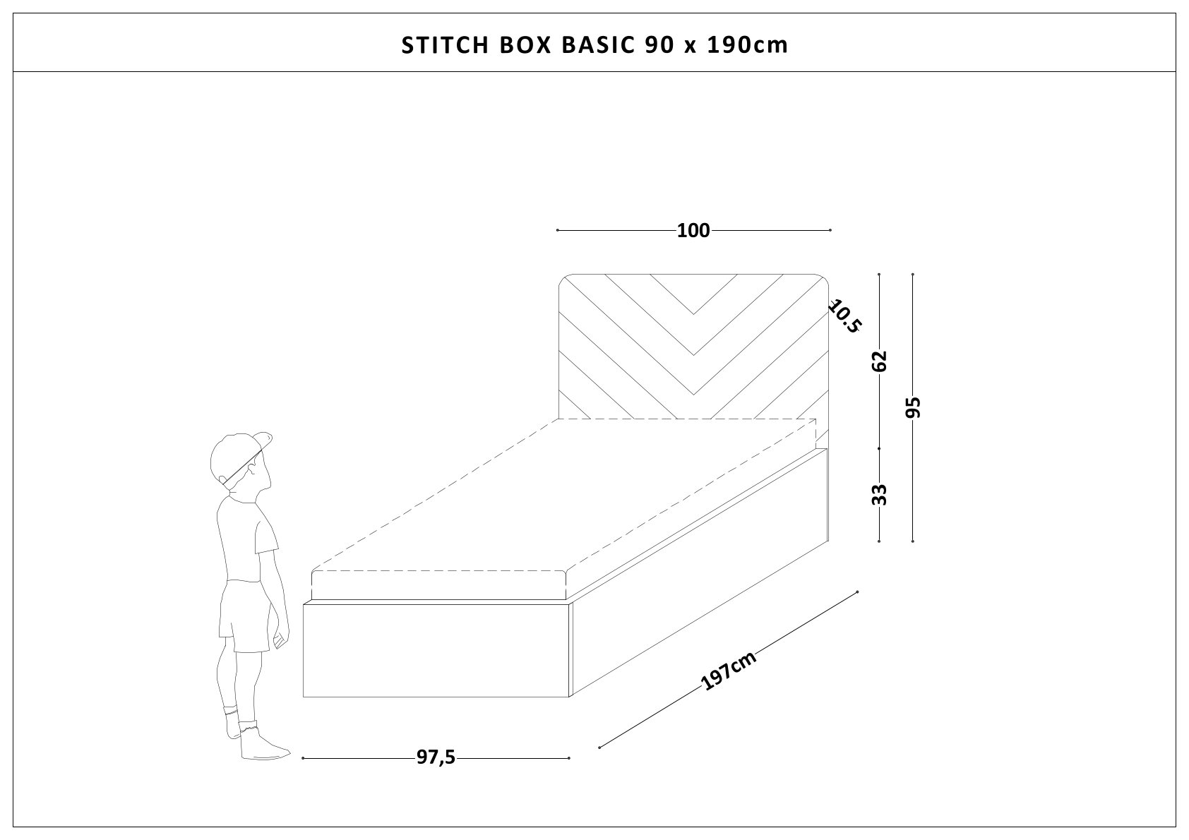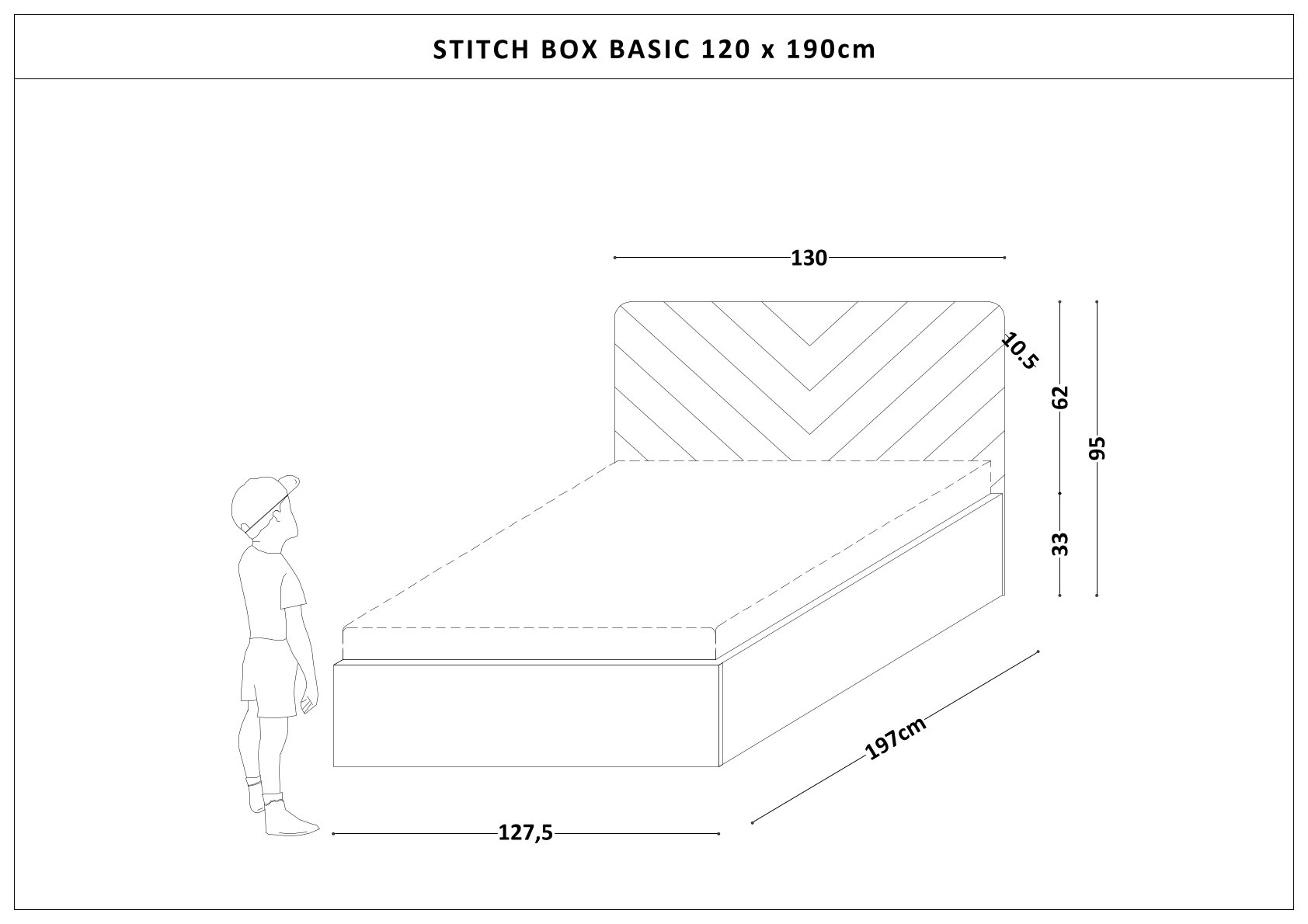 Łóżko ma tapicerowany zagłówek i pojemną skrzynię otwieraną do góry w kolorze z naszej palety BASIC.