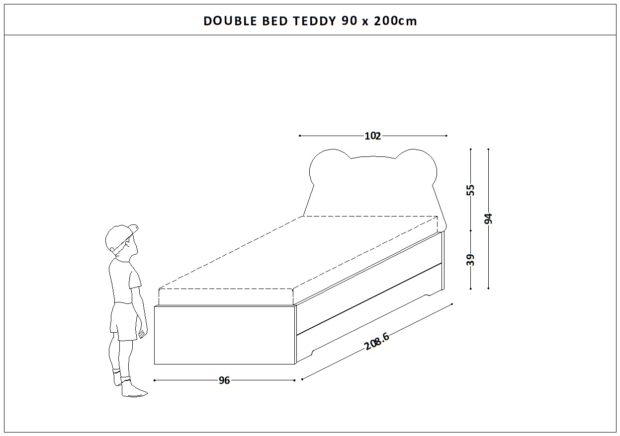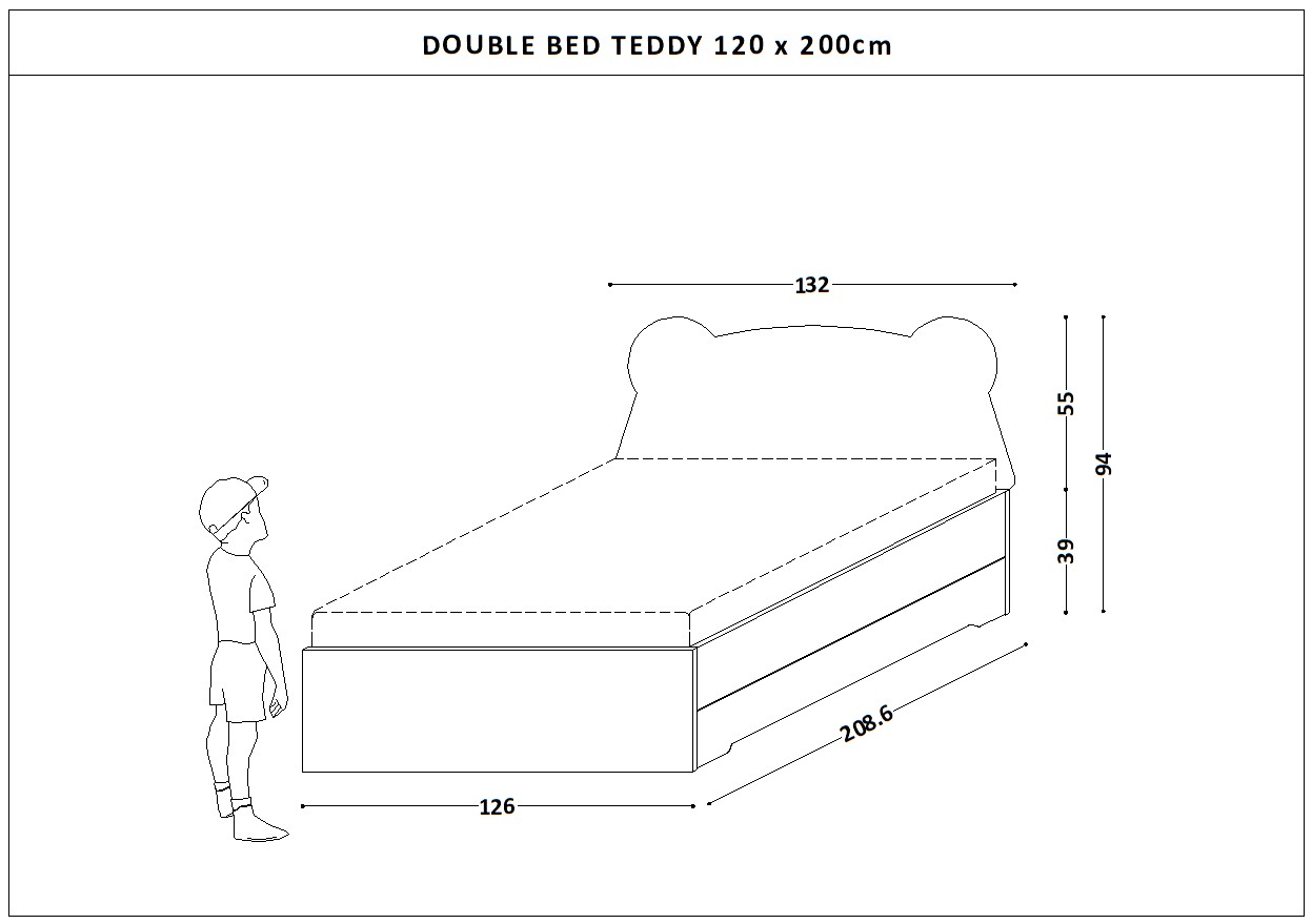 Wyjątkowe, podwójne tapicerowane łóżko DOUBLE BED z zagłówkiem w kształcie Misia Teddy i wysuwaną szufladą na materac lub pościel.