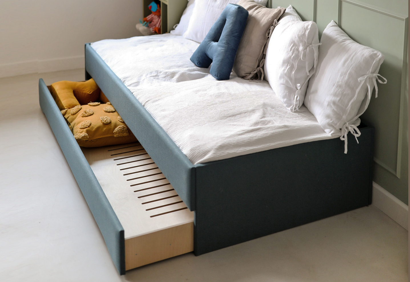 -duża szuflada na kółkach, czyli miejsce na drugi, zapasowy materac, albo schowek na zabawki, pościele i koce,