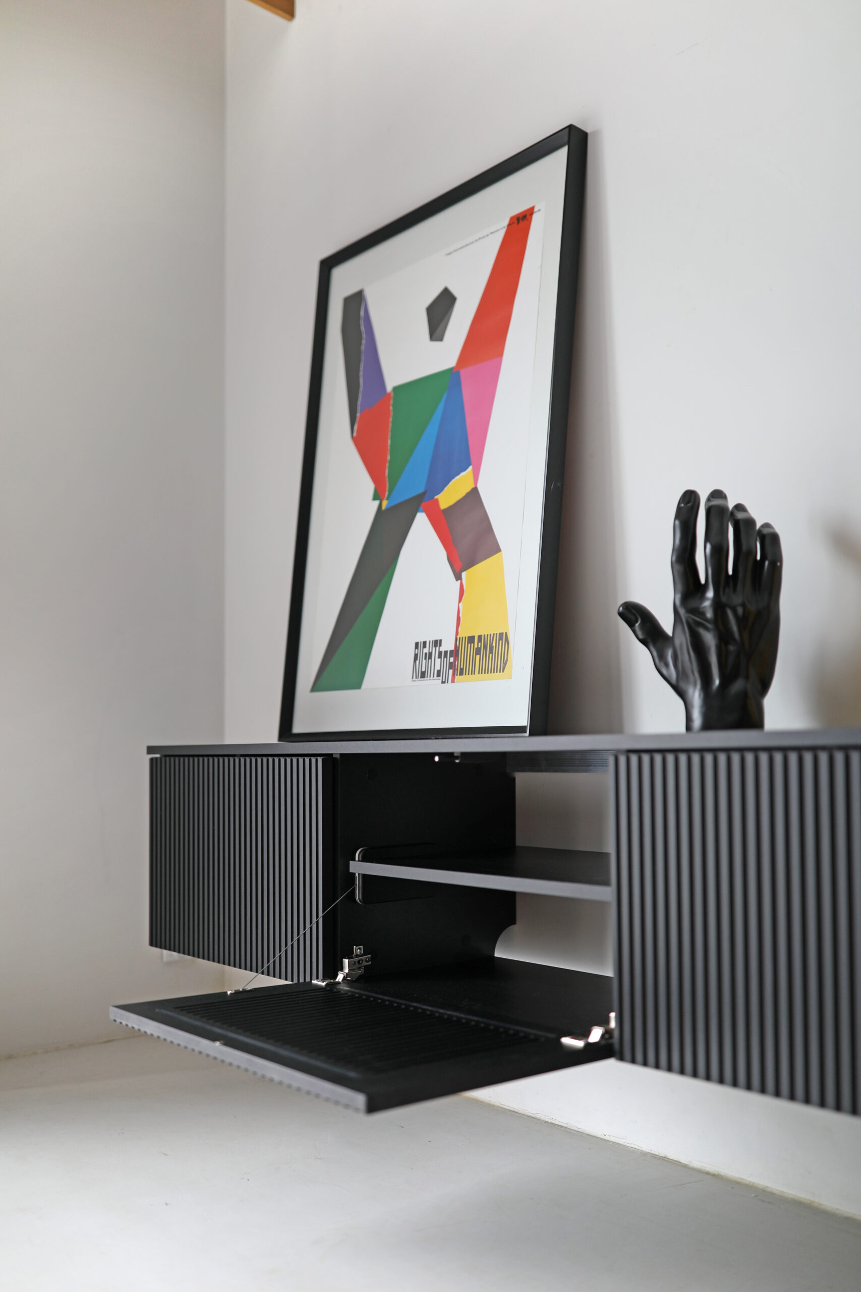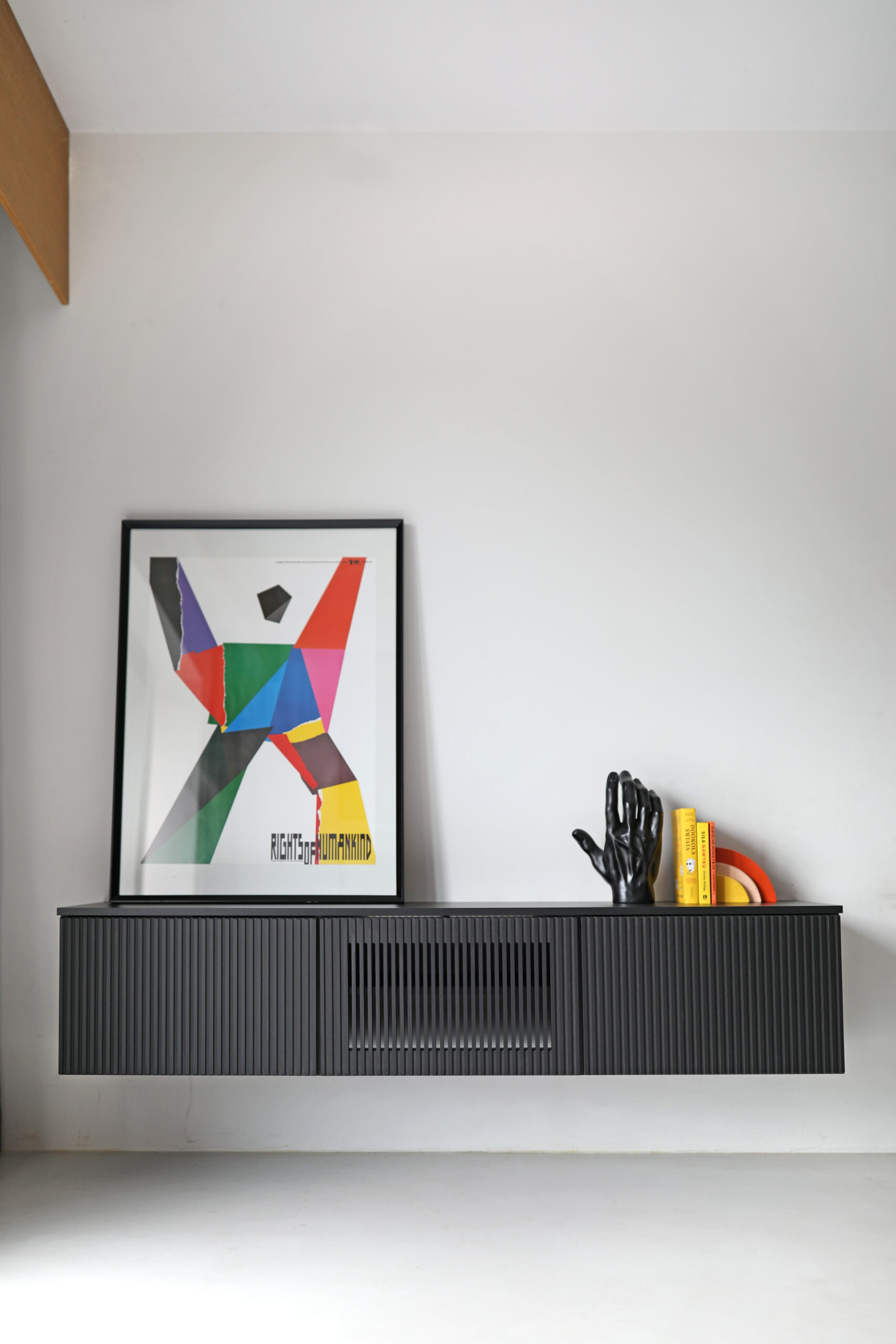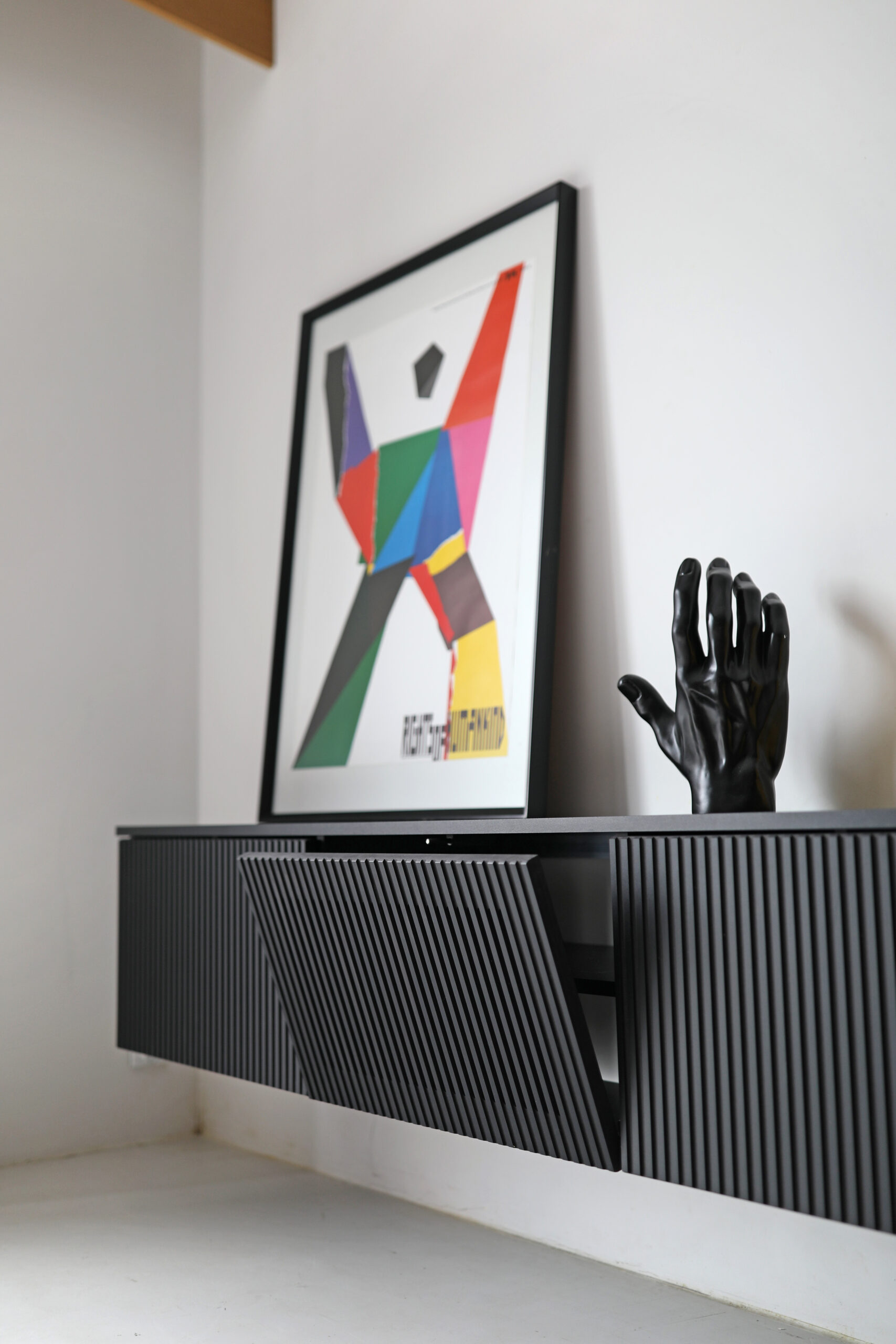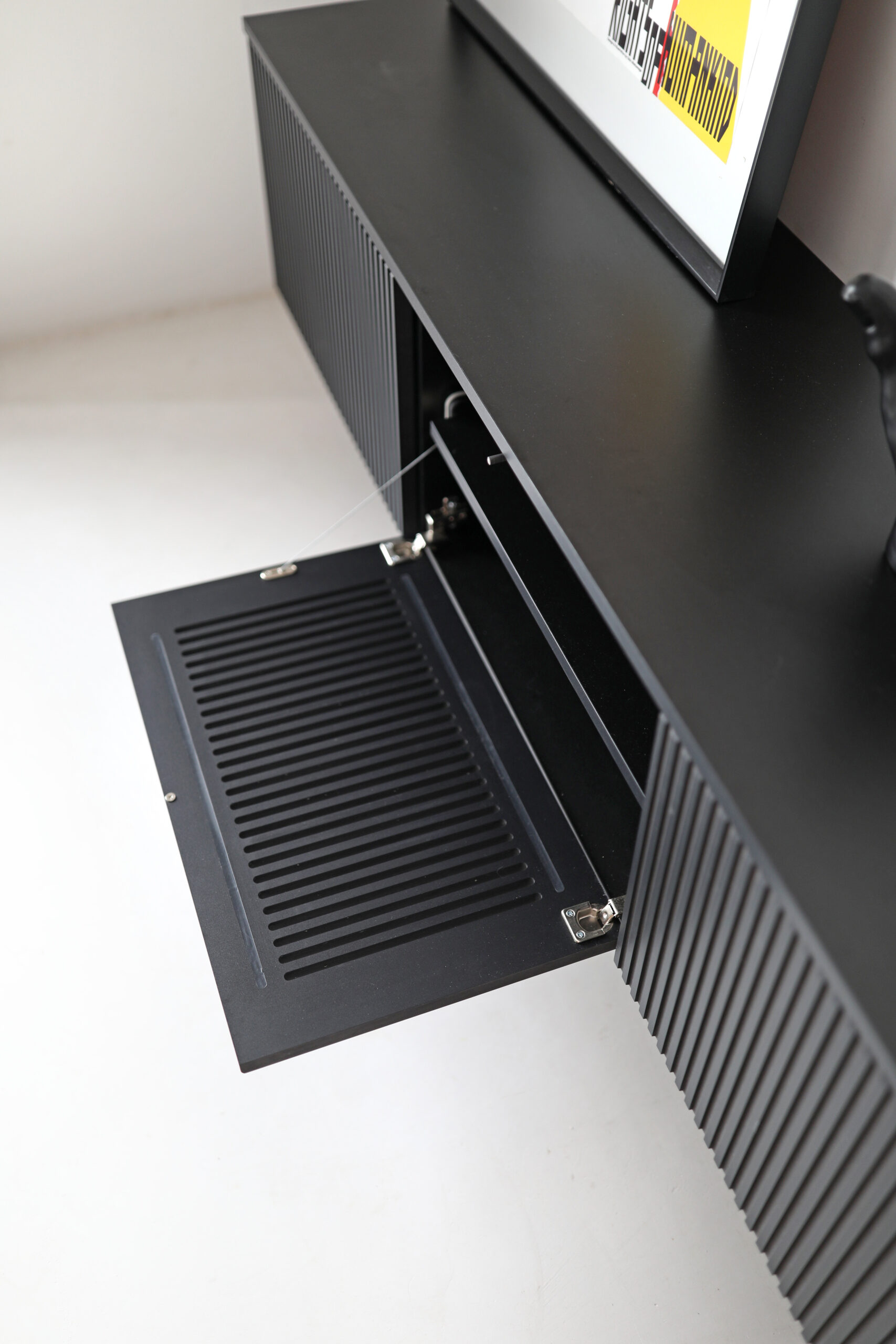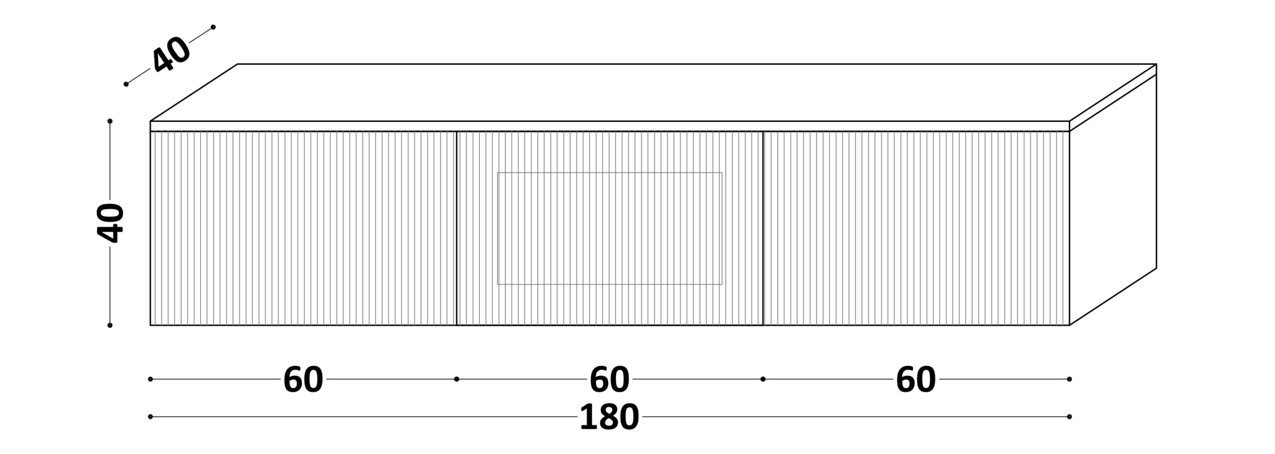 Podwieszana szafka RTV LINE z frontem z cienkimi lamelami.