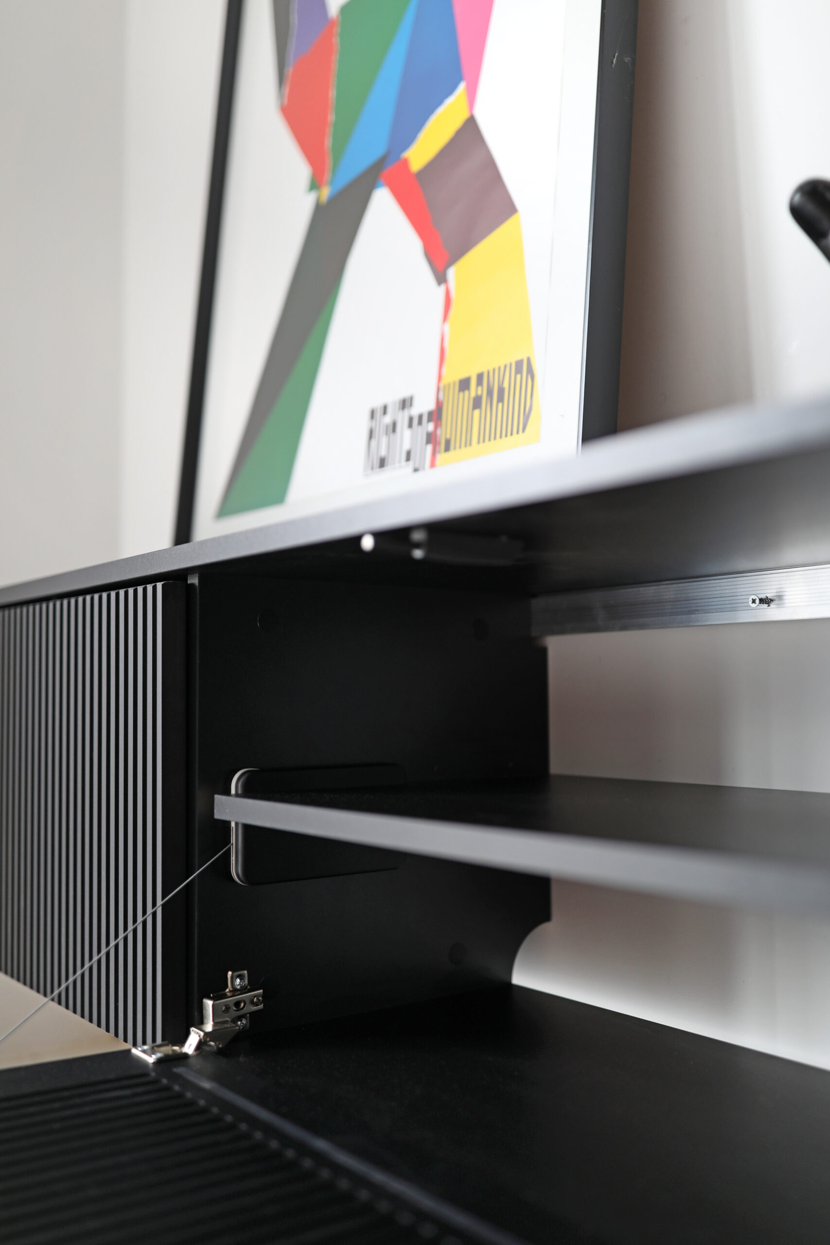 Rozwiązanie: Specjalnie opracowane, autorskie fronty z wertykalnymi otworami, które są ukryte pomiędzy lamelami. Takie elementy są bardzo estetyczne, a jednocześnie pozwalają na obsługę pilotem sprzętów znajdujących się w środku szafki. Koniec z kurzeniem się dekodera na blacie!