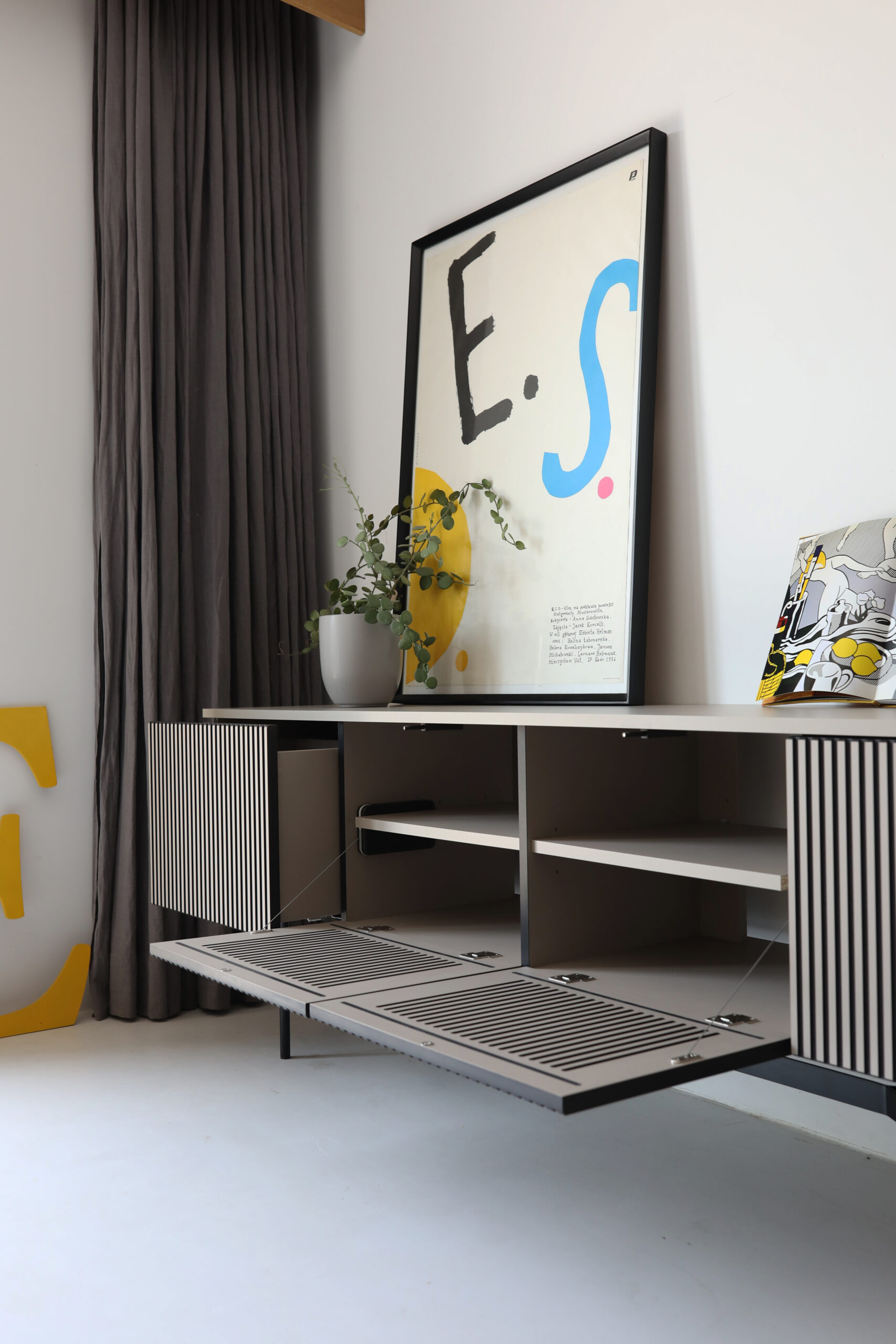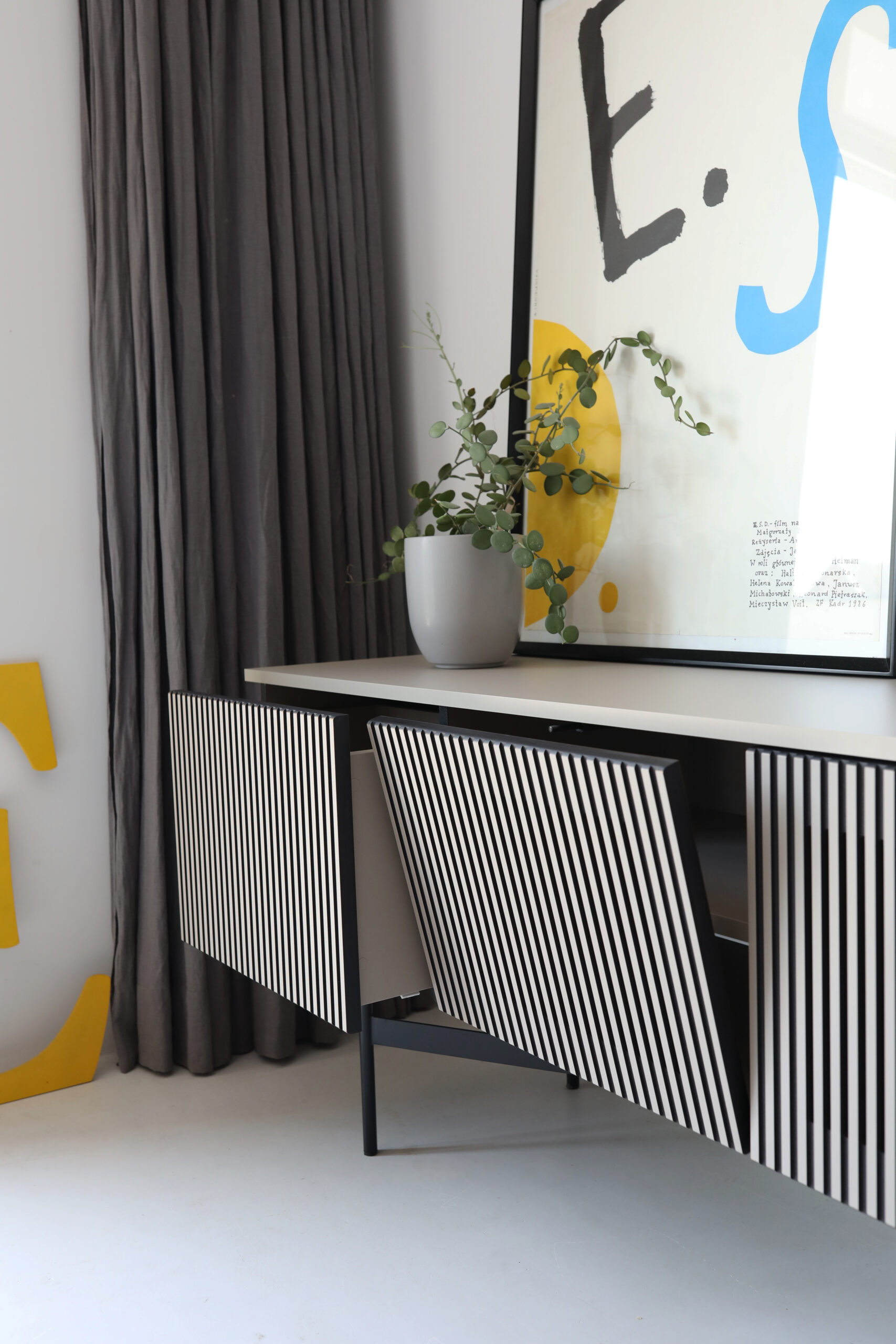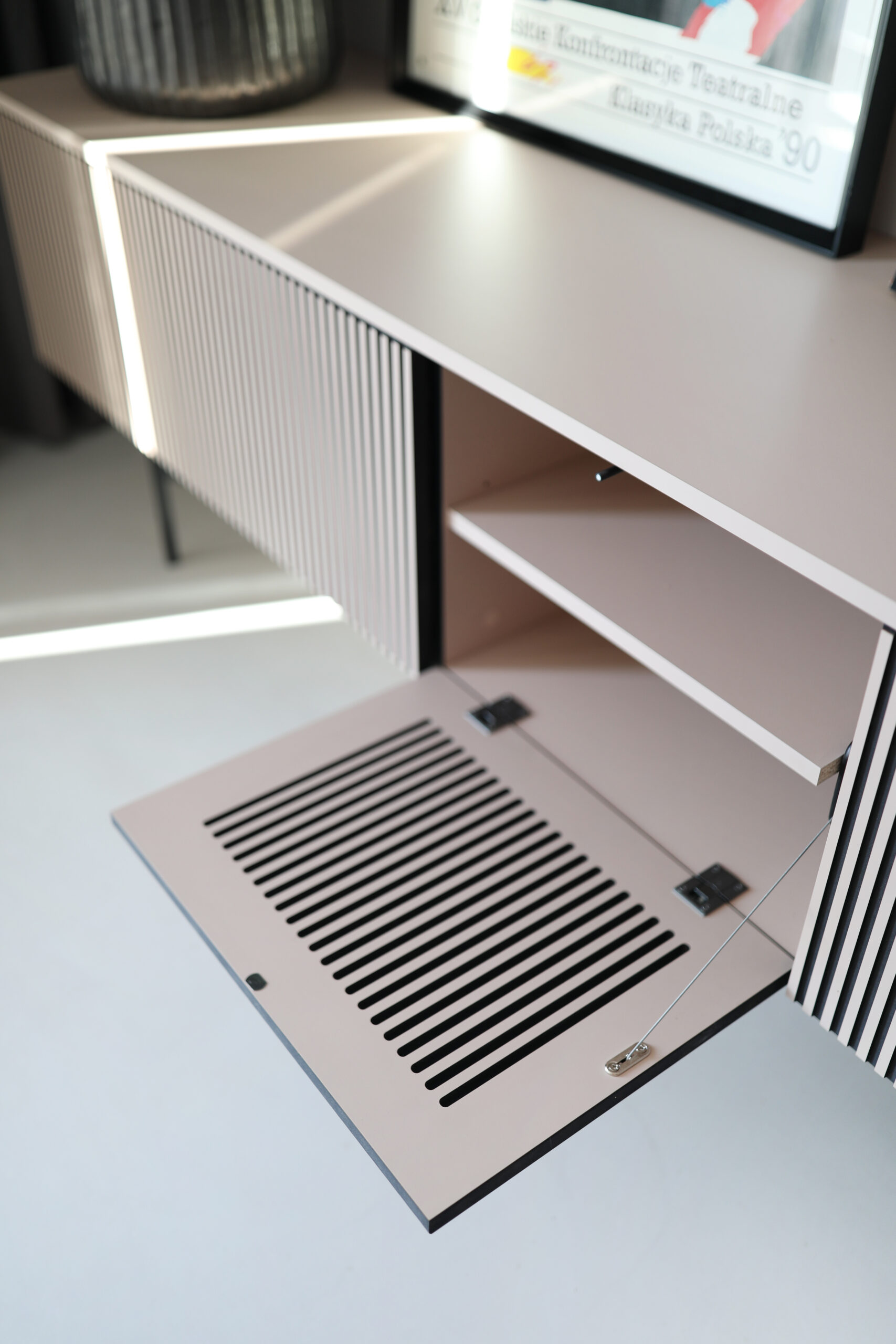 Fronty szafki RTV z cienkimi lamelami nie tylko dają rewelacyjny wygląd, ale są też sprytnym rozwiązaniem, które pozwala na ukrycie sprzętu audio w szafce, bez utraty jakości połączenia z pilotem.