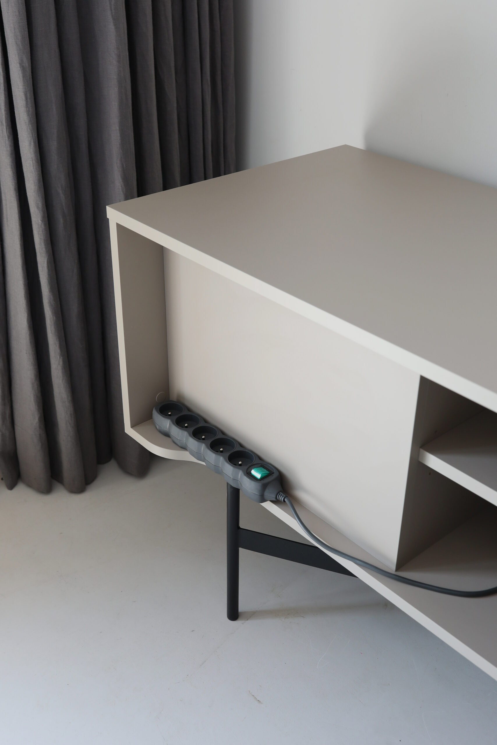 2. Co jeśli masz na ścianie masywną ramkę z gniazdkami, anteną i kabel ethernet, do których chcesz podłączyć sprzęty? A może z Twojej ściany jest wyprowadzony peszel na przewody i trzeba go zakryć meblem? Jak zmieścić w szafce plątaninę kabli i podpiąć wiele sprzętów naraz? Rozwiązanie: *Spłyciliśmy całe plecy mebla o około 8 cm i zostawiliśmy je otwarte w strategicznych miejscach, aby ukryć wszystkie kłopotliwe kable. Przygotowaliśmy także małe półeczki, aby położyć na nich przedłużacze.