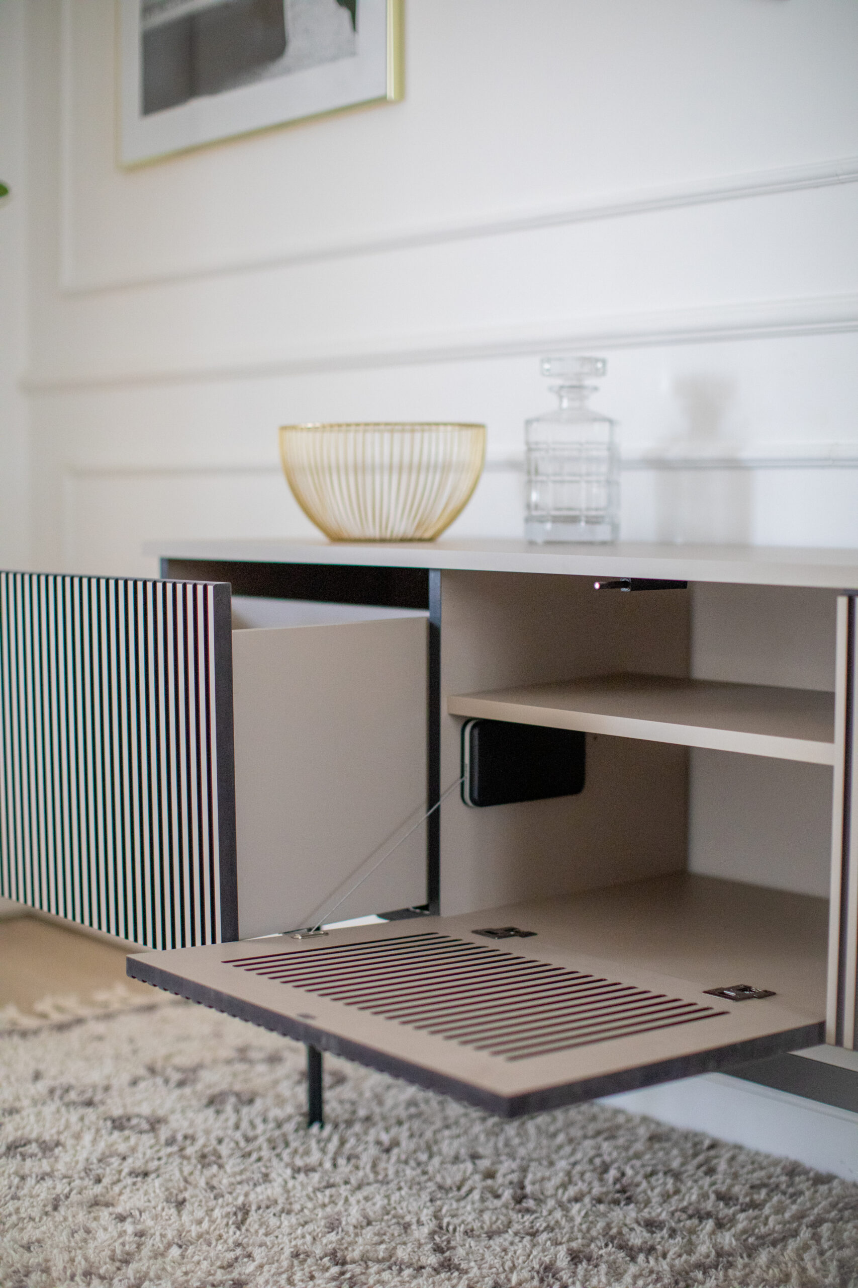 Rozwiązanie: Specjalnie opracowane, autorskie fronty z wertykalnymi otworami, które są ukryte pomiędzy lamelami. Takie elementy są bardzo estetyczne, a jednocześnie pozwalają na obsługę pilotem sprzętów znajdujących się w środku szafki. Koniec z kurzeniem się dekodera na blacie!