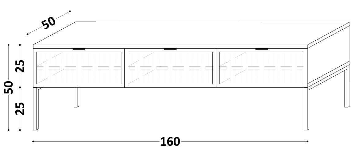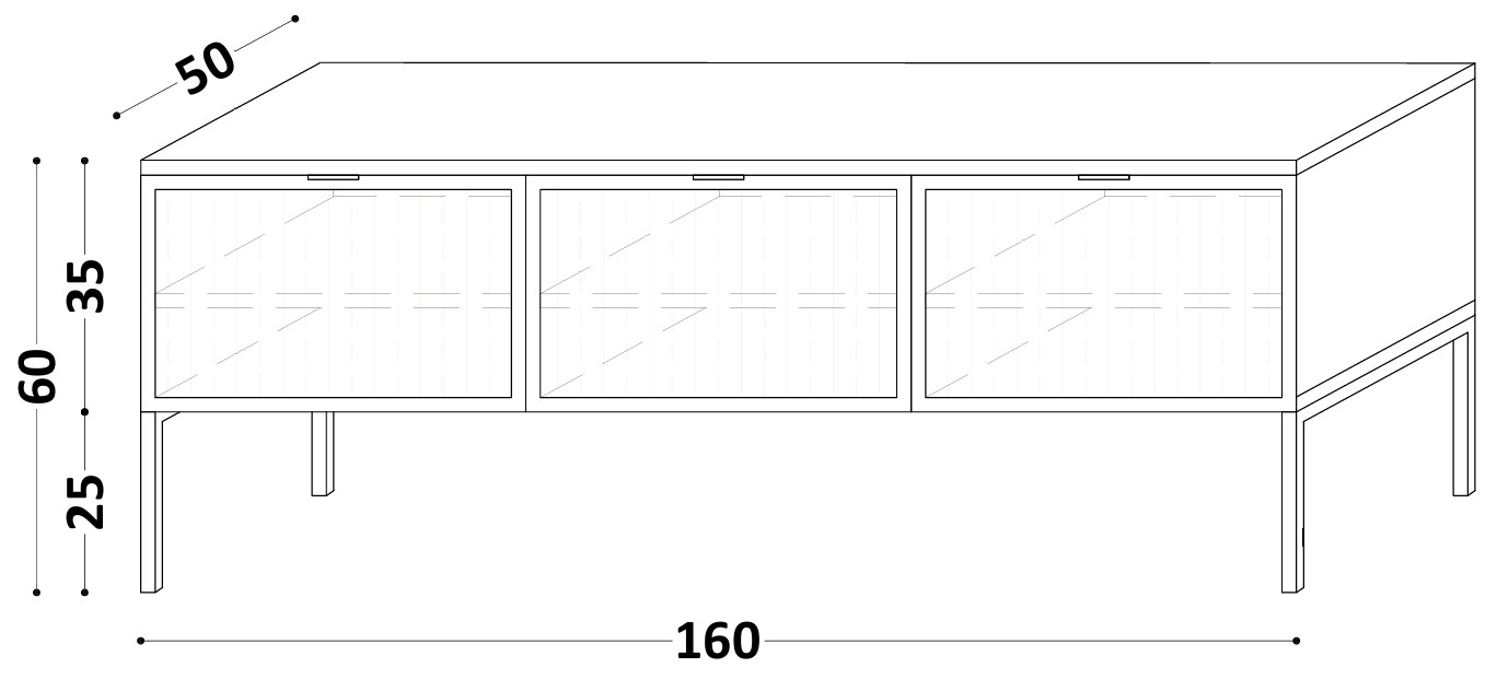 Charakterystyczną cechą naszej szafki RTV jest półtransparentne, ryflowane szkło, zamknięte w aluminiową ramę. Karbowana powierzchnia szyby przypomina lodową taflę, dodając szafce uroku i oryginalnego sznytu. W środkowym segmencie mebla znajduje się prostokątna przelotka na kable.