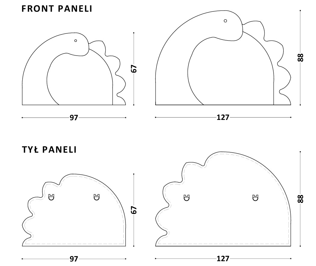 Tapicerowany zagłówek w kształcie dinozaura. Może służyć jako zagłówek do dowolnego łóżka lub jako niezależny panel ścienny.